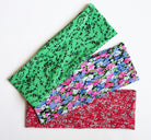 Summer Green is a pretty green with black print. Red Poppy is red with white and black floral. Multi Pink/Blue has pinks, bluish purple, white black and green.