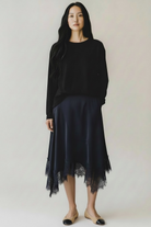 This skirt features an asymmetric hem with a lace-trimmed bottom for subtle movement and detail. Crafted from lightweight fabric, it offers a relaxed yet refined silhouette that’s versatile for a range of occasions.