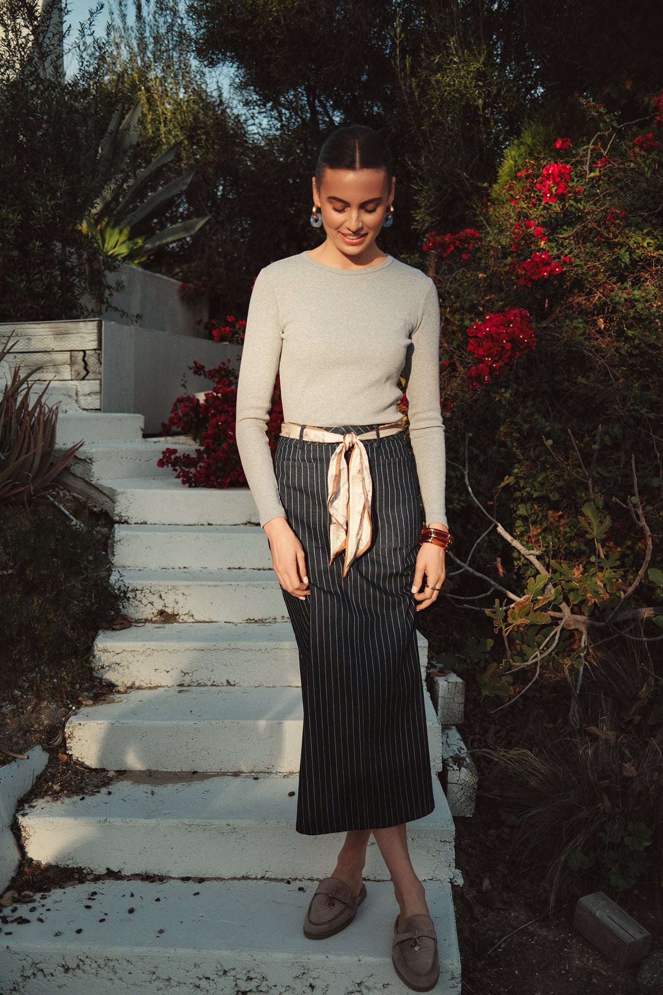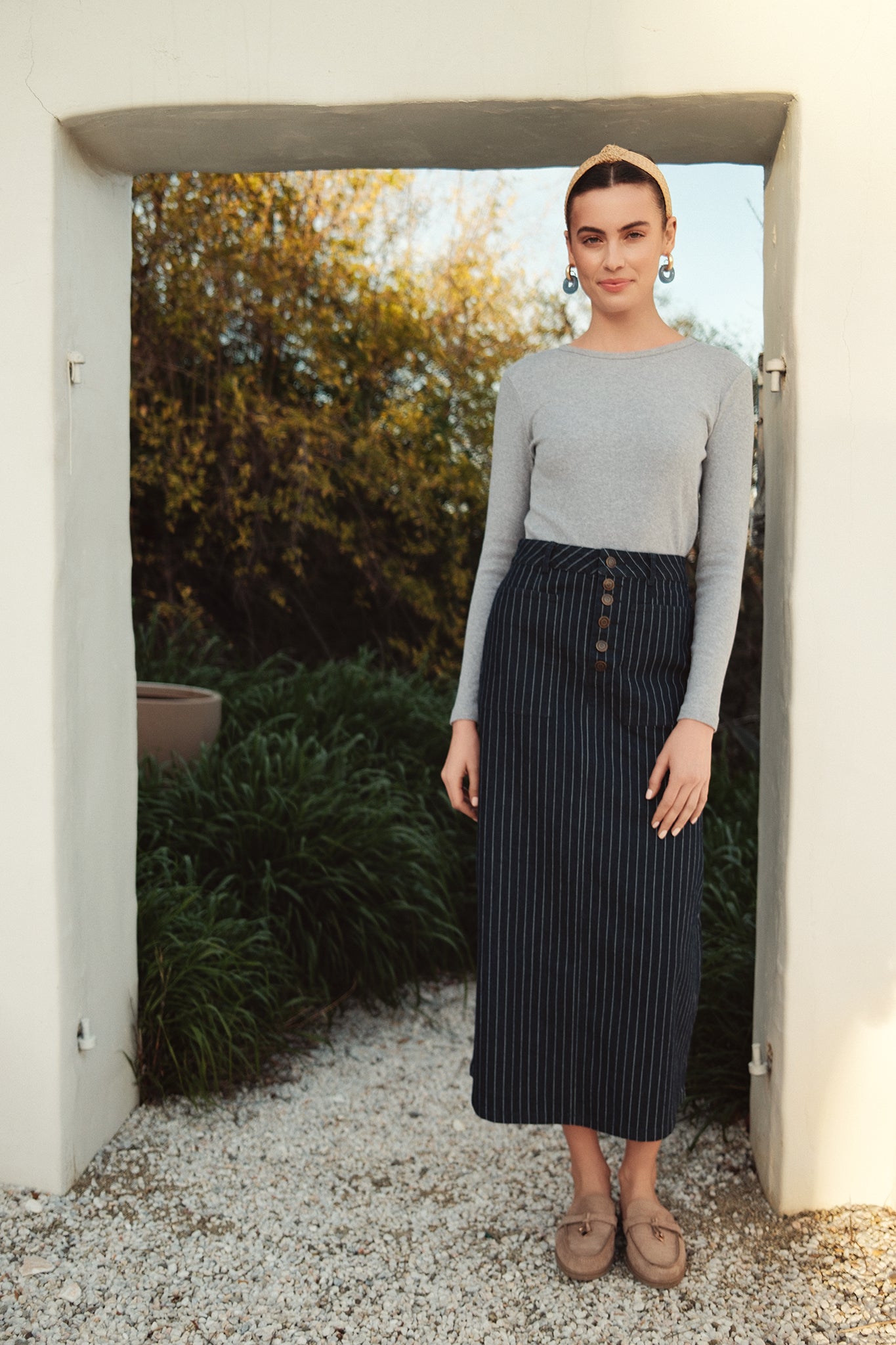 Add a twist to classic denim with our Pinstripe Denim Skirt. Made from soft, durable denim, this skirt features subtle vertical pinstripes that add a touch of sophistication to casual looks. Its flattering cut and versatile length make it perfect for pairing with everything from tees and sneakers to blouses and heels. Effortless, stylish, and unique—this skirt is a wardrobe upgrade you’ll reach for again and again.