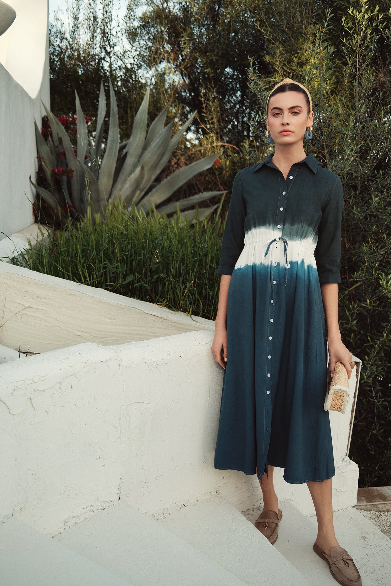 The dip-dye shirtdress features a soft gradient effect for a modern, understated look. Crafted from lightweight fabric with a relaxed silhouette, it balances effortless style with subtle detail.