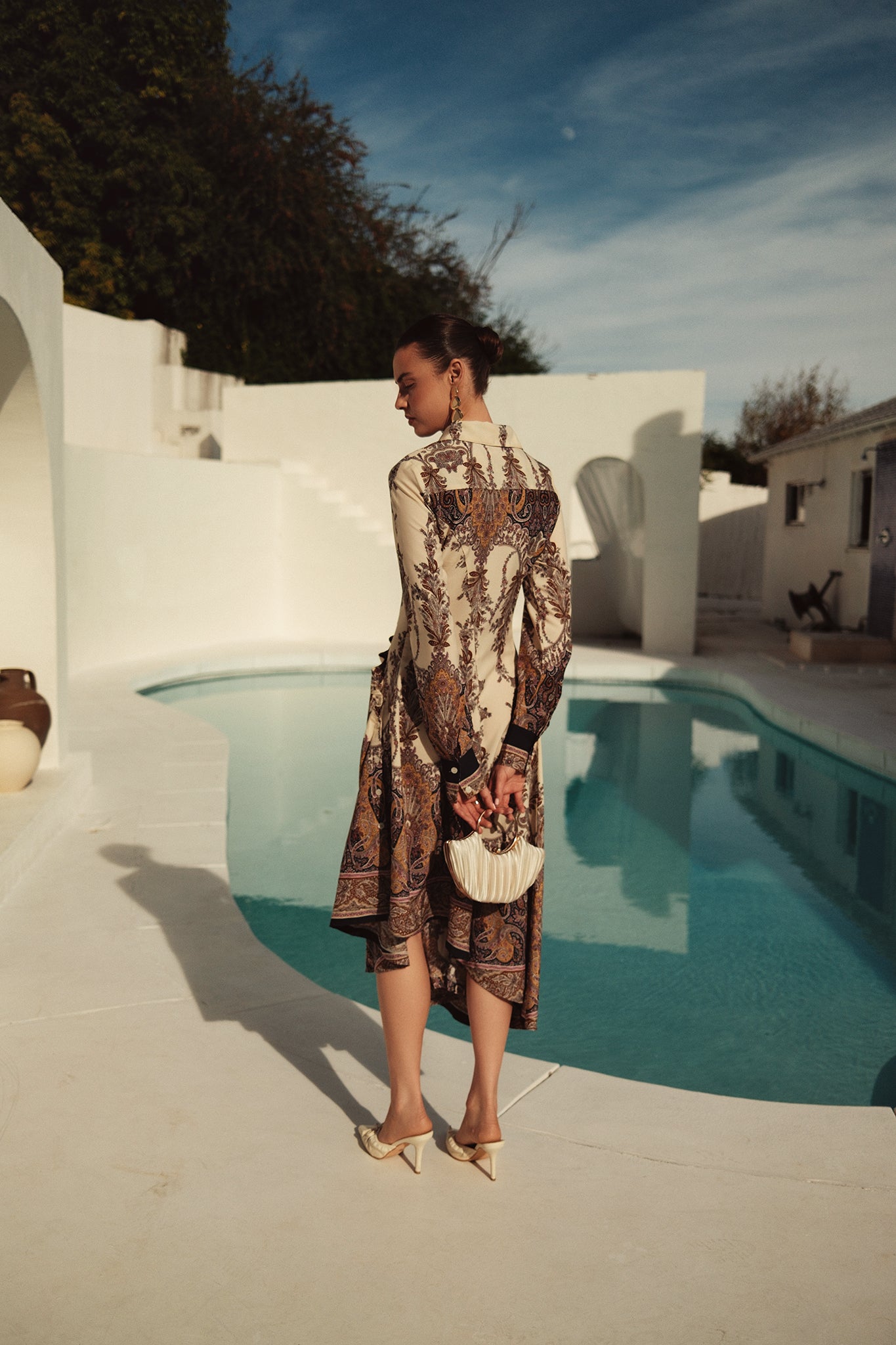 This gathered button paisley dress features subtle detailing that adds interest without feeling overstated. Soft gathering adds texture and movement, while a button-front design keeps the look classic and easy. Finished with an asymmetric hem, it offers a modern update to a timeless paisley pattern.