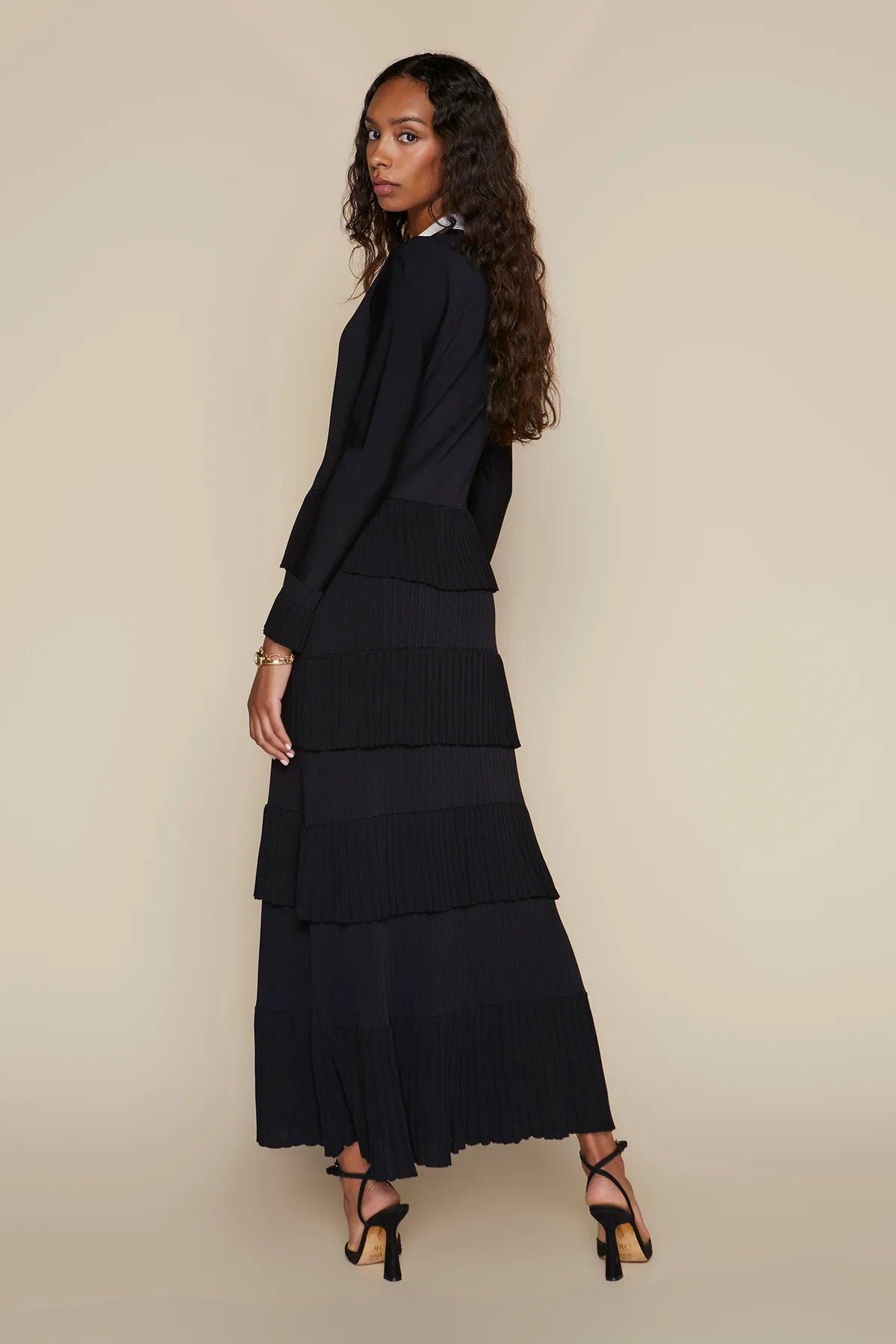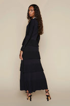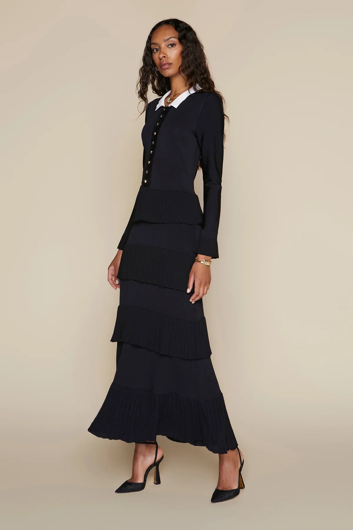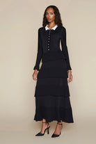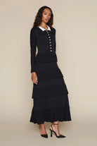 The Lena Dress combines refined elegance with contemporary design. Crafted from Apparalel's luxurious knit fabric, this maxi dress features a sophisticated silhouette with a defined waist and gracefully tiered ruffle skirt. Delicate scalloped detailing adorns the button placket, collar, and hem, adding an understated touch of femininity. Perfect for elevated occasions or polished everyday wear, this piece transitions effortlessly from day to evening.