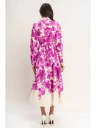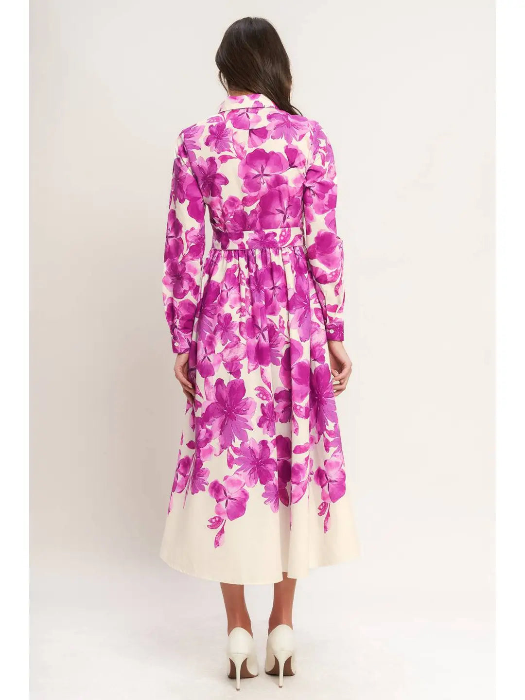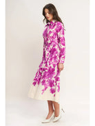 A beautifully printed woven midi shirt dress featuring long sleeves, a self belt, front button down and full skirt.