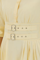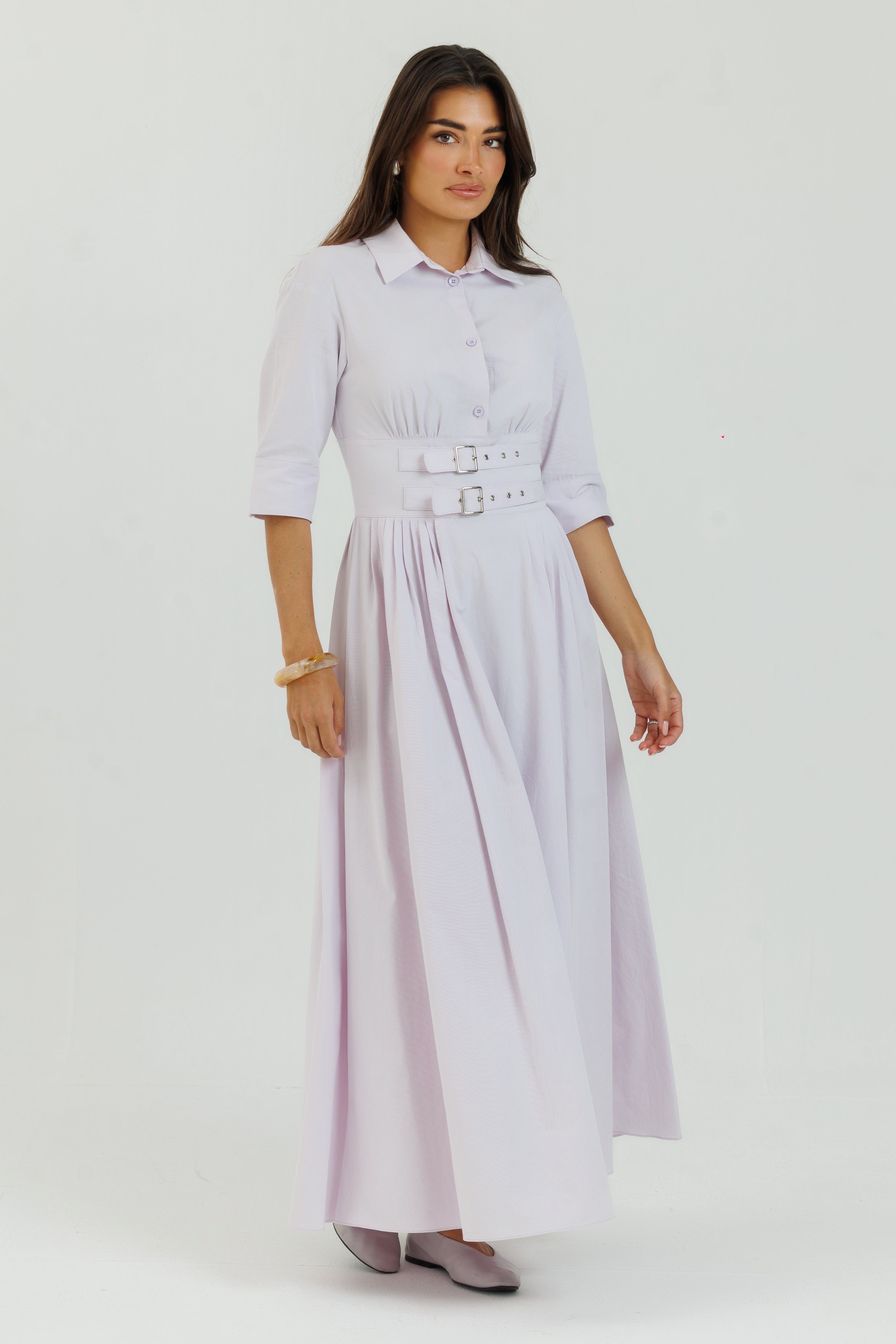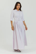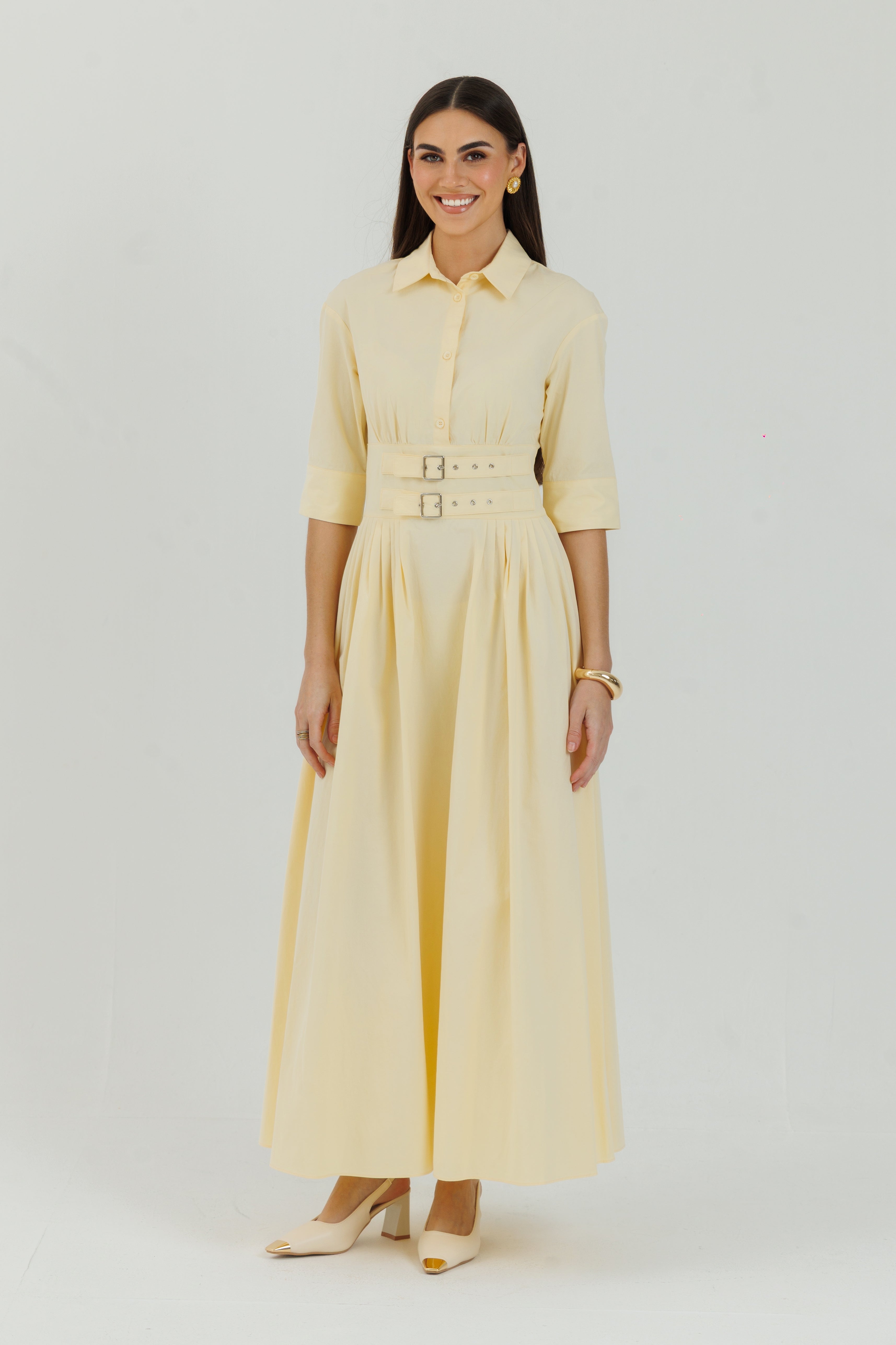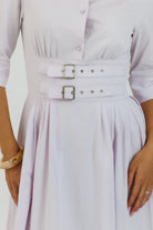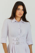 This breezy cotton midi features a crisp collar, button-down front, and flattering three-quarter sleeves for an effortlessly polished look. Designed with two statement buckles at the waistband to cinch and define, it’s an easy, summer-ready silhouette that feels as good as it looks.