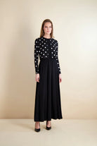 The cardi overlay set feels youthful, sweet, and effortlessly put together. The sleeveless black jersey jumper features a softly fitted bodice and a flowing full skirt that drapes beautifully on the body. Layered with a lightweight stretch black-and-ivory polka dot cardigan, it adds just the right touch of charm with delicate covered buttons and an airy, comfortable feel. Easy to wear and easy to love, this set moves seamlessly from everyday errands to casual weekends. It’s a fresh, feminine look that feels fun without ever trying too hard.