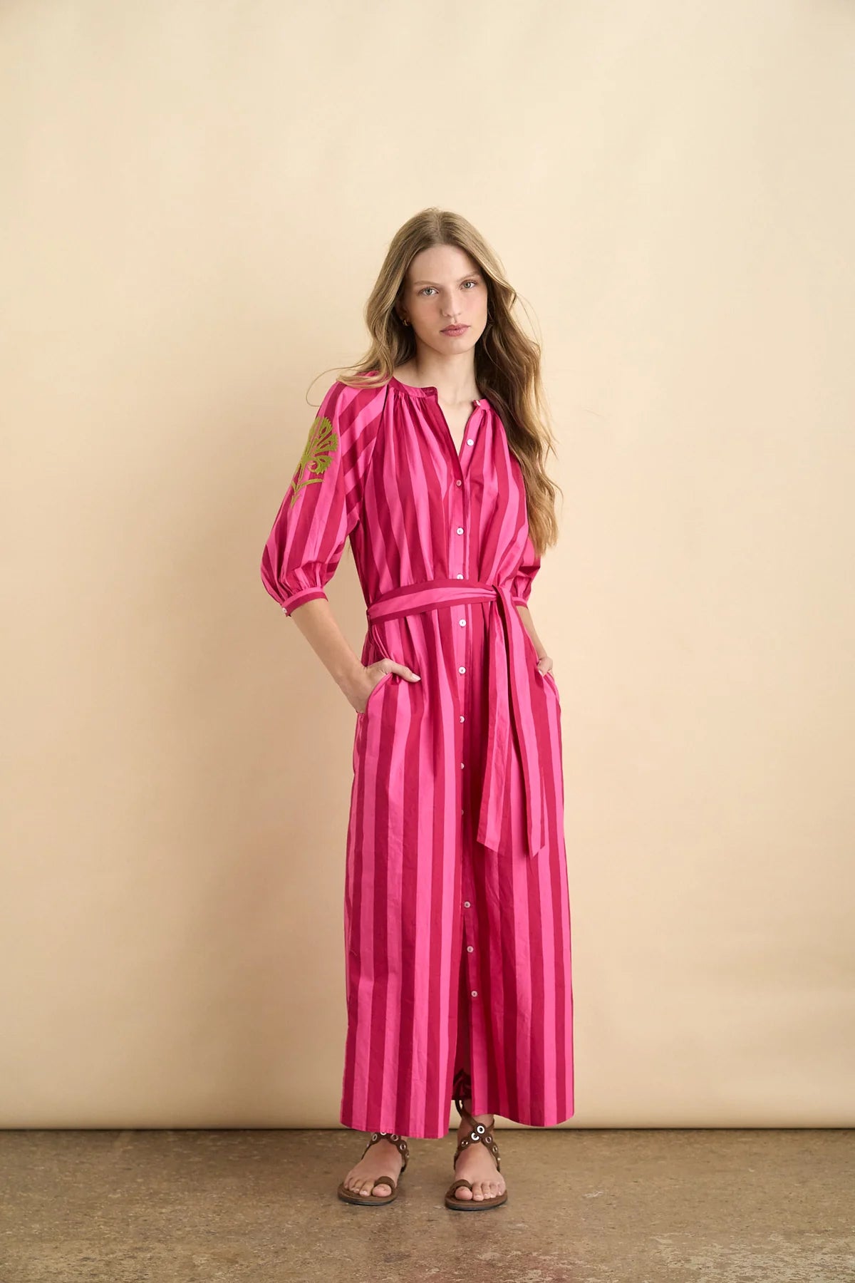This kaftan-style straight-cut dress is fully buttoned down and comes with a matching belt for a customizable fit