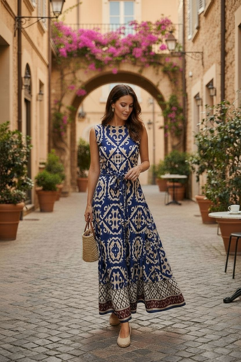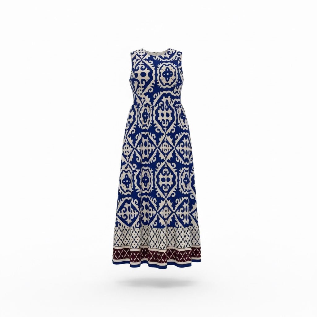 Point Georgette Column Dress - Blue Portofino Print