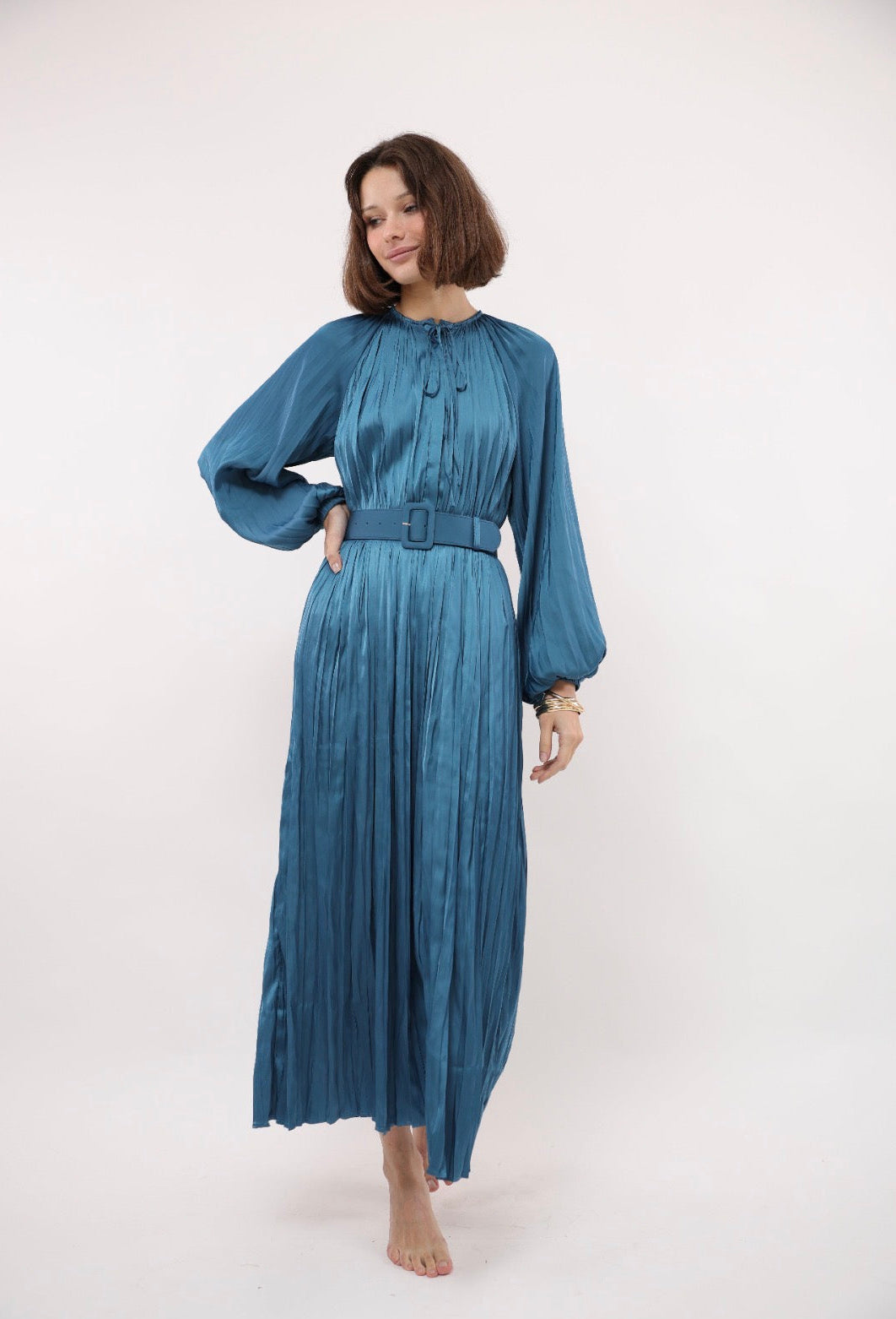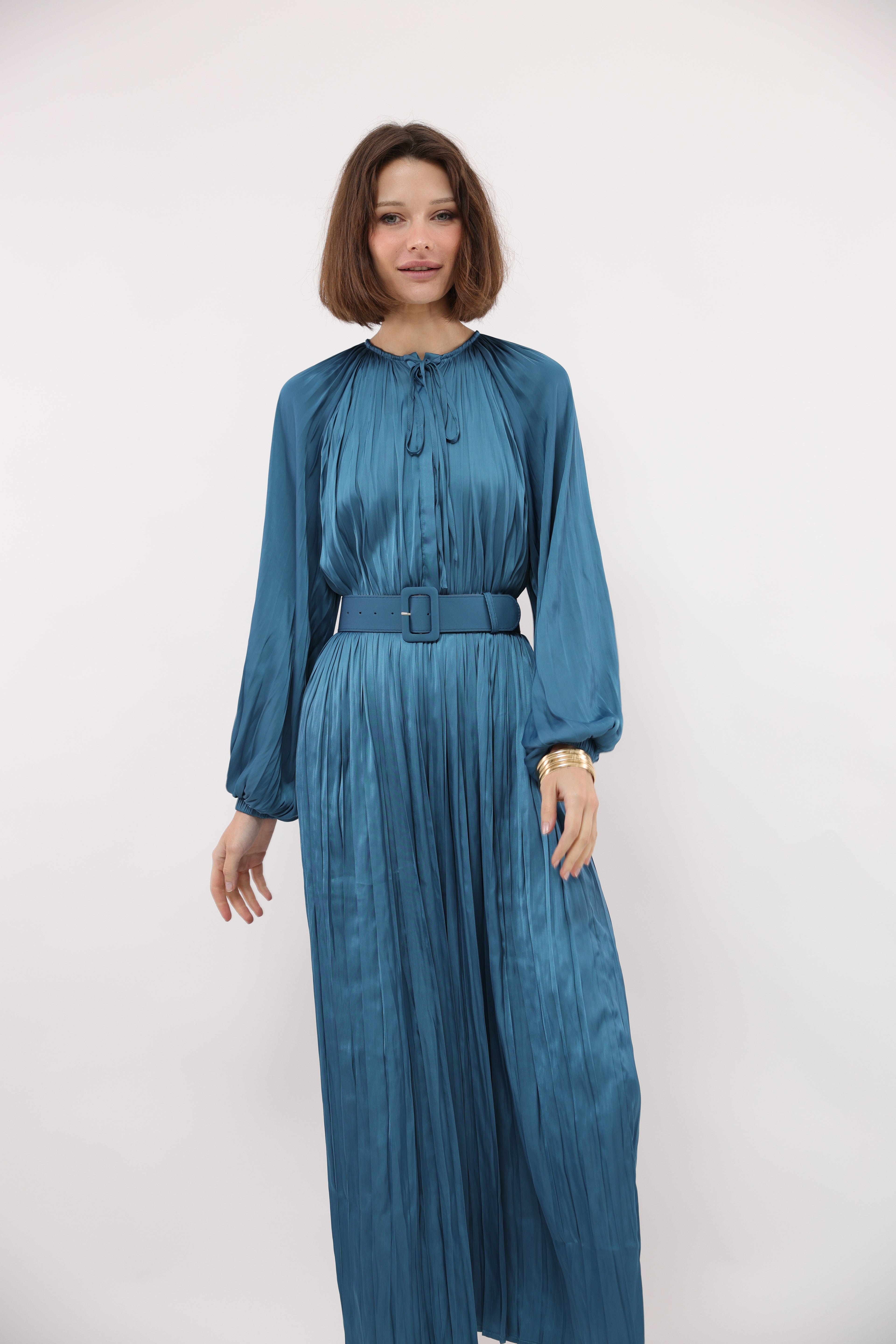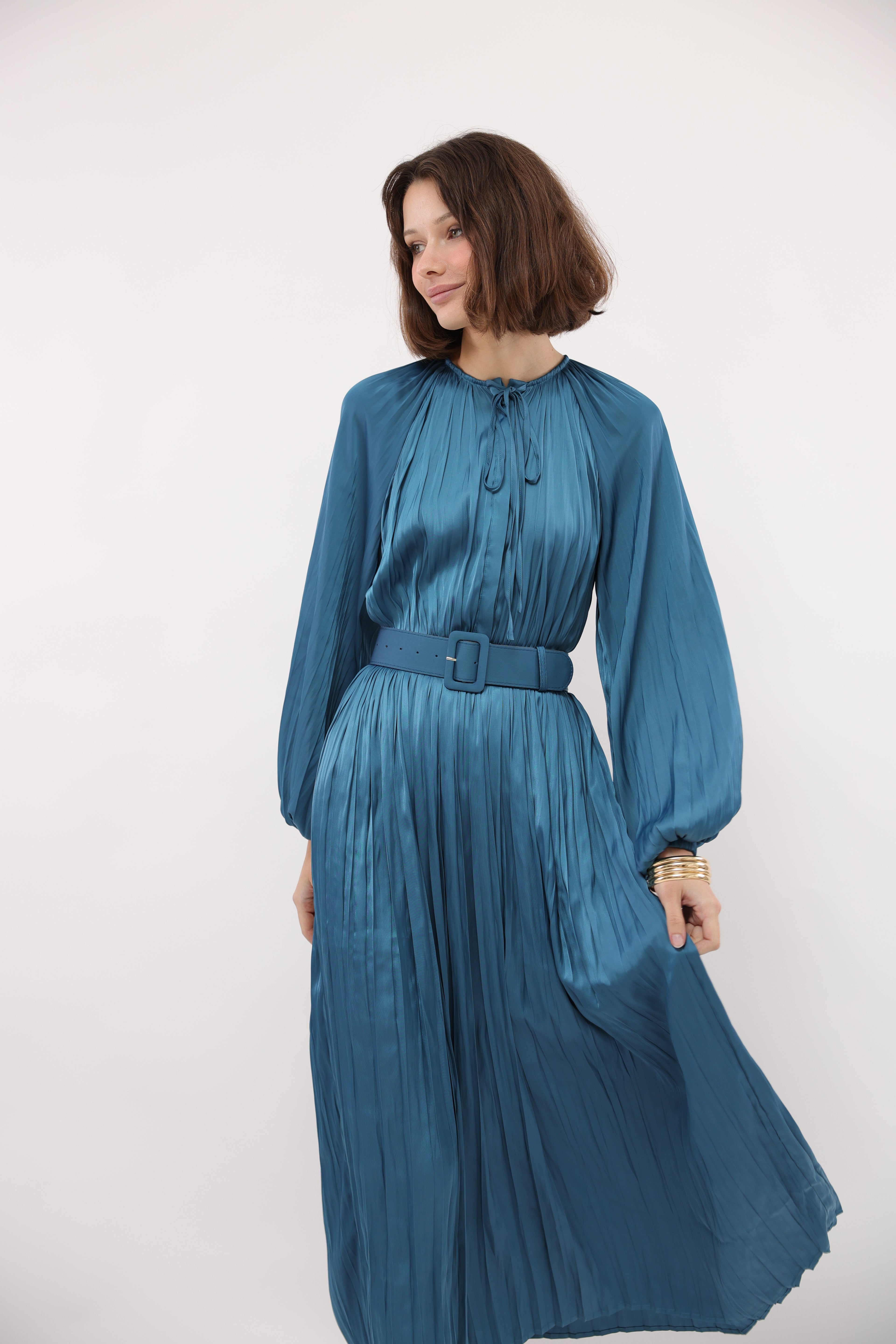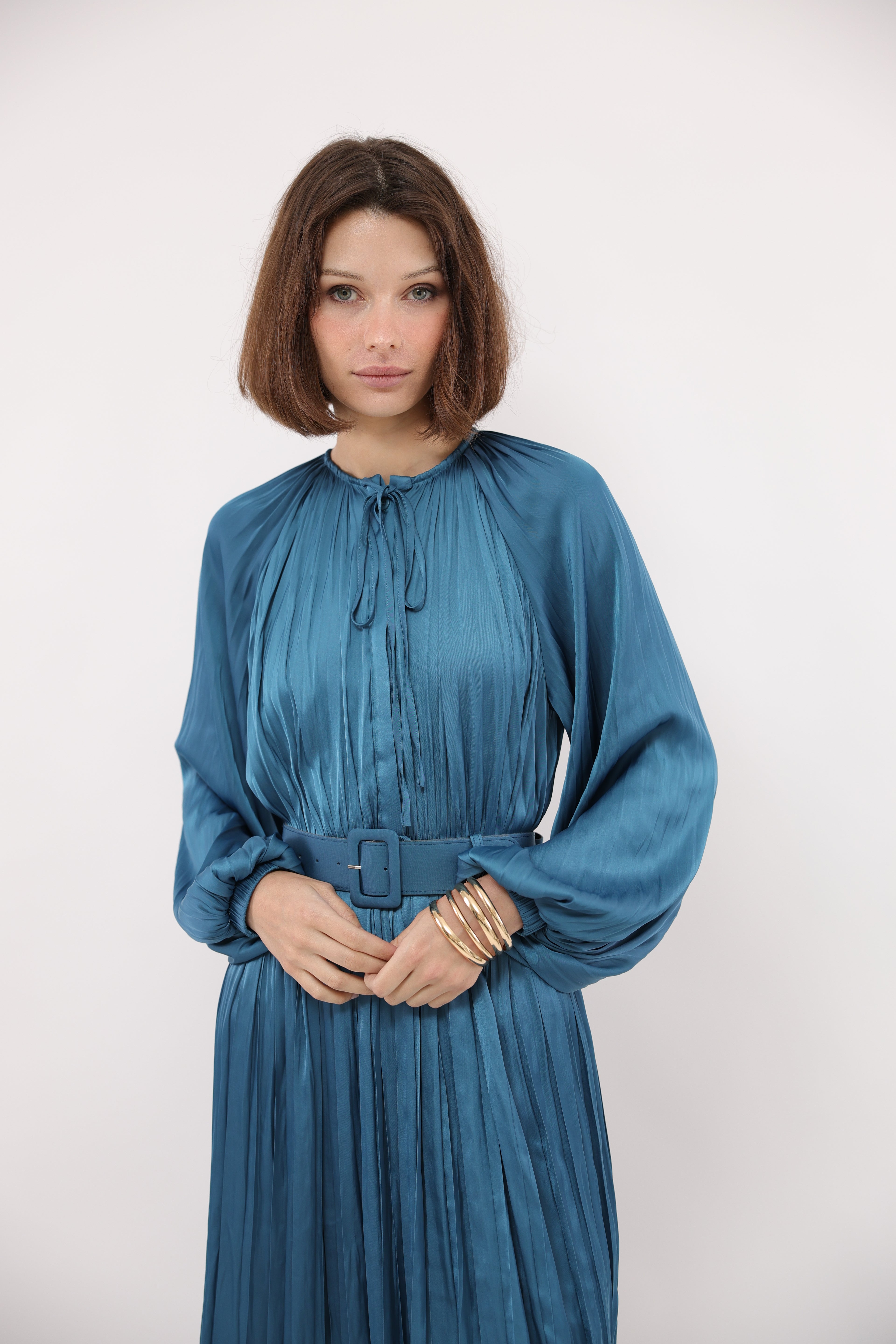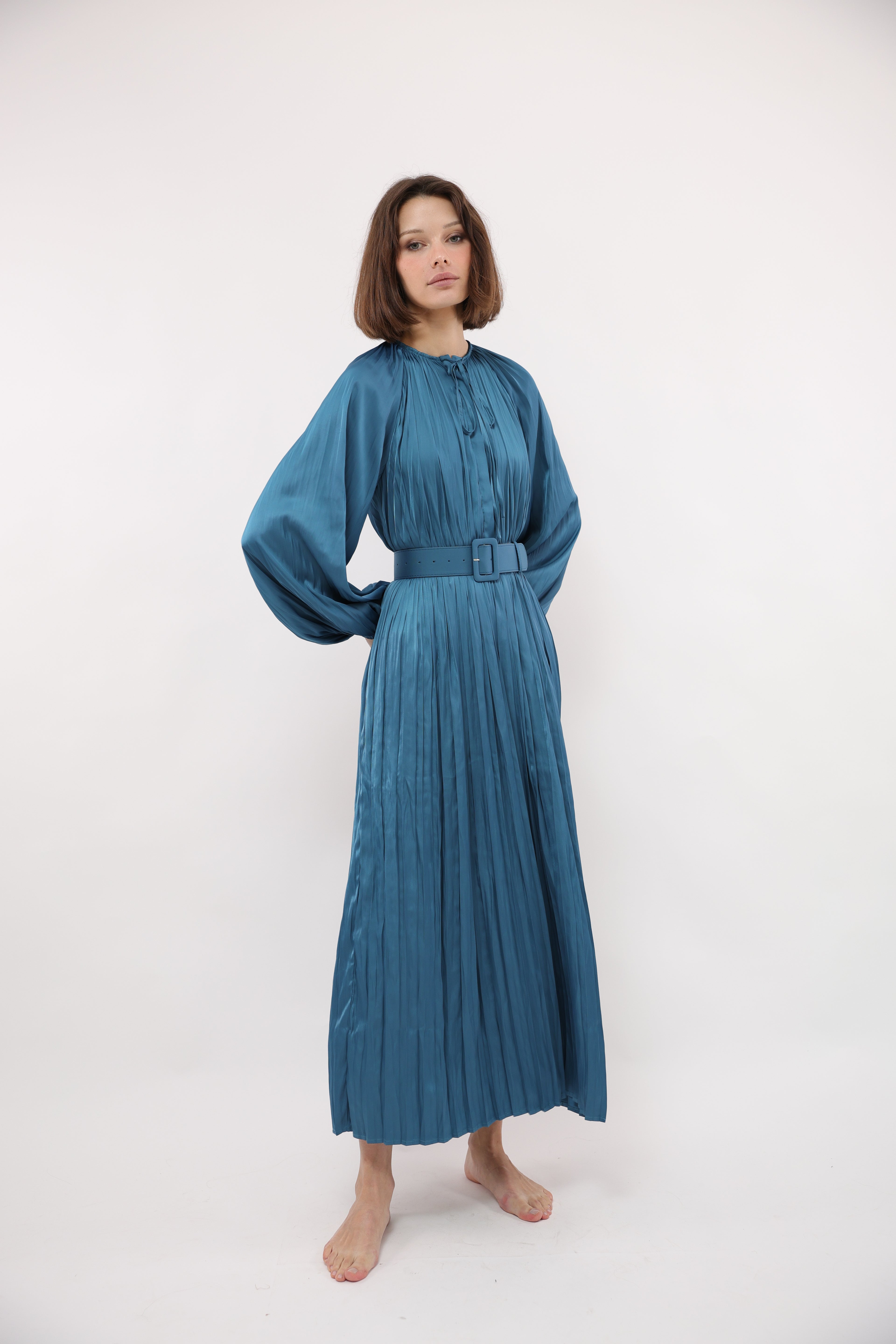 The Betty Dress is an elegant satin creation that blends timeless style with a modern twist. With its flowing pleated design and vibrant pop of color, it offers both simplicity and sophistication. The henley button-front and tie-neck detailing add an extra layer of charm, while the waist-cinching fit and long puff sleeves complete the refined, classic look.