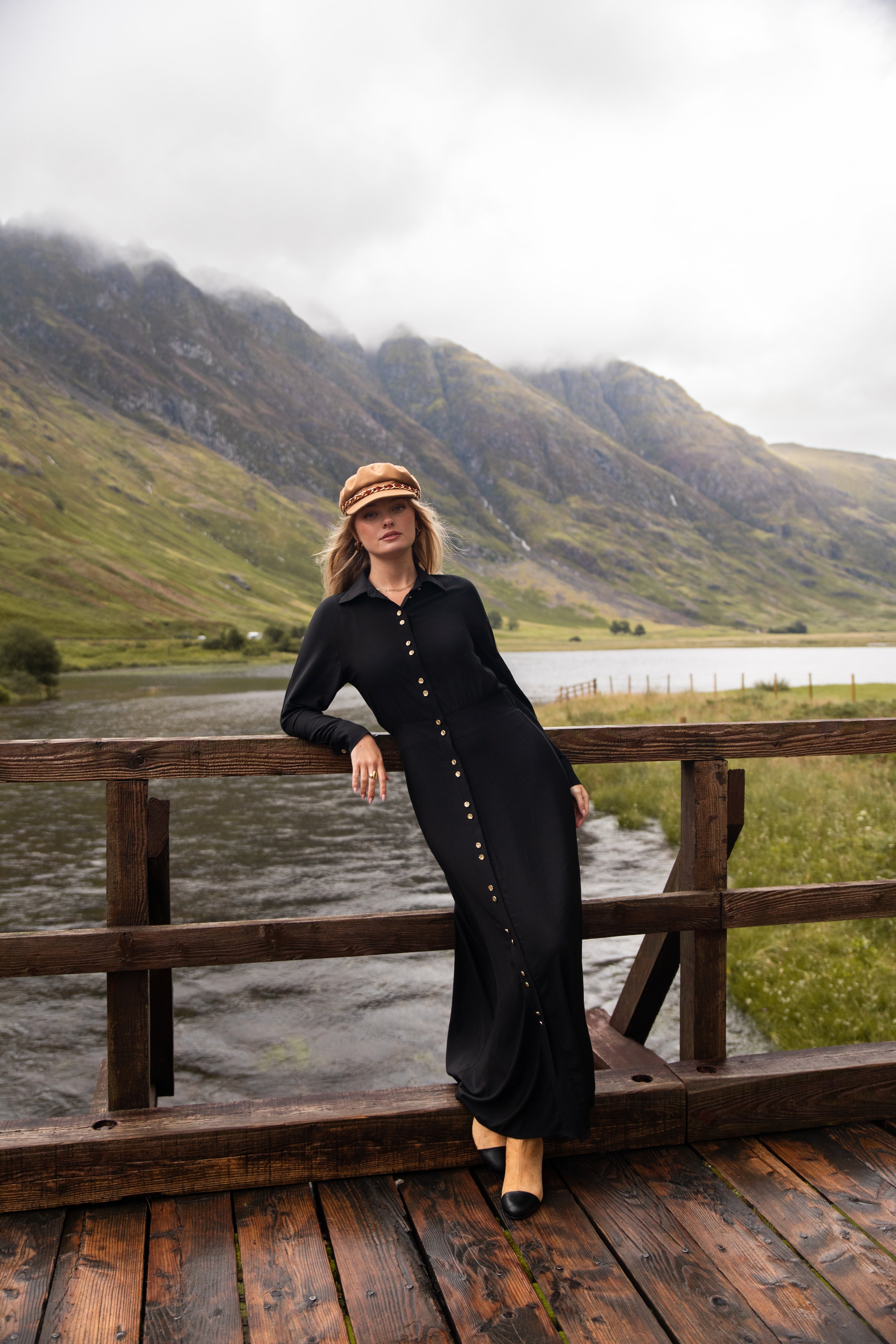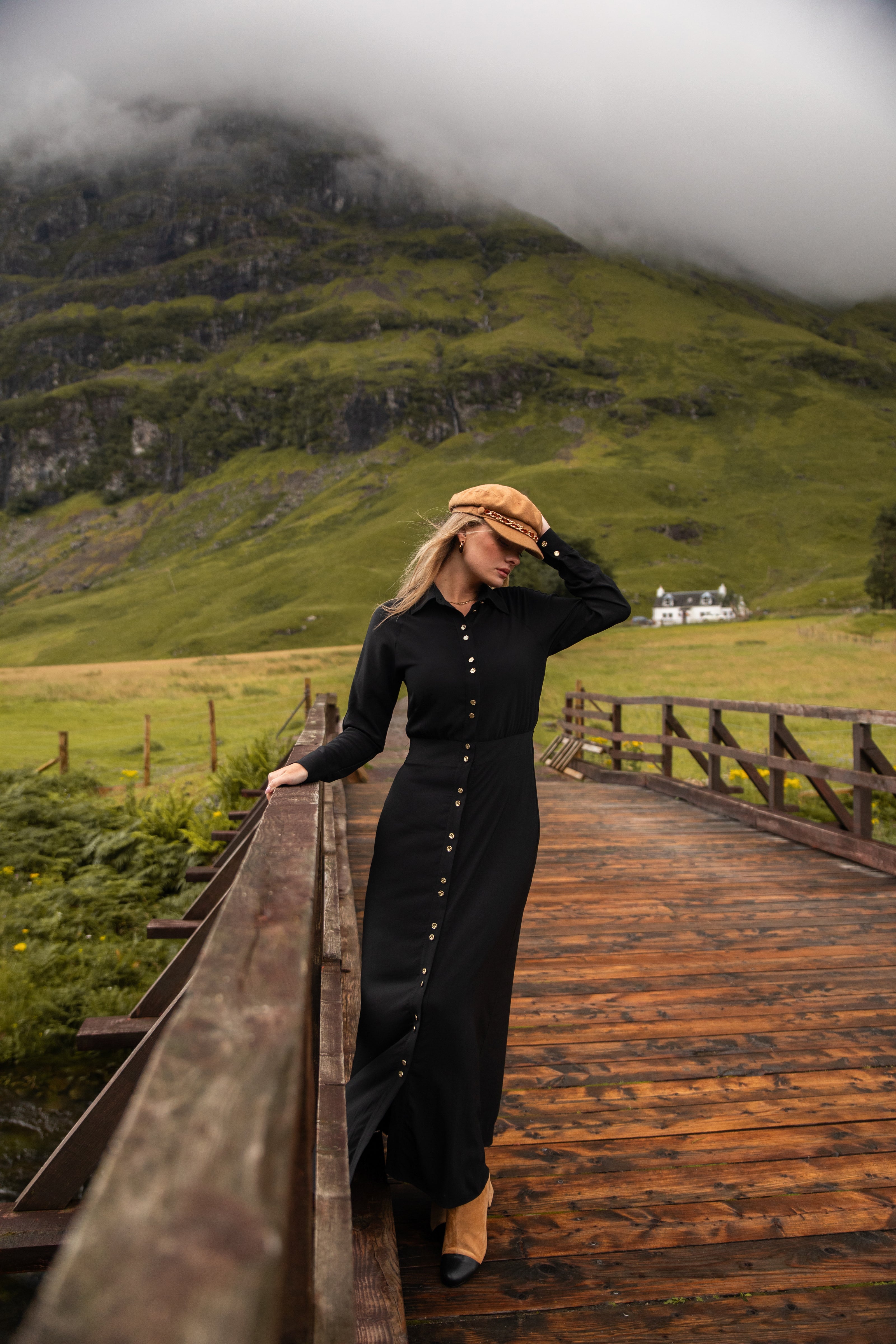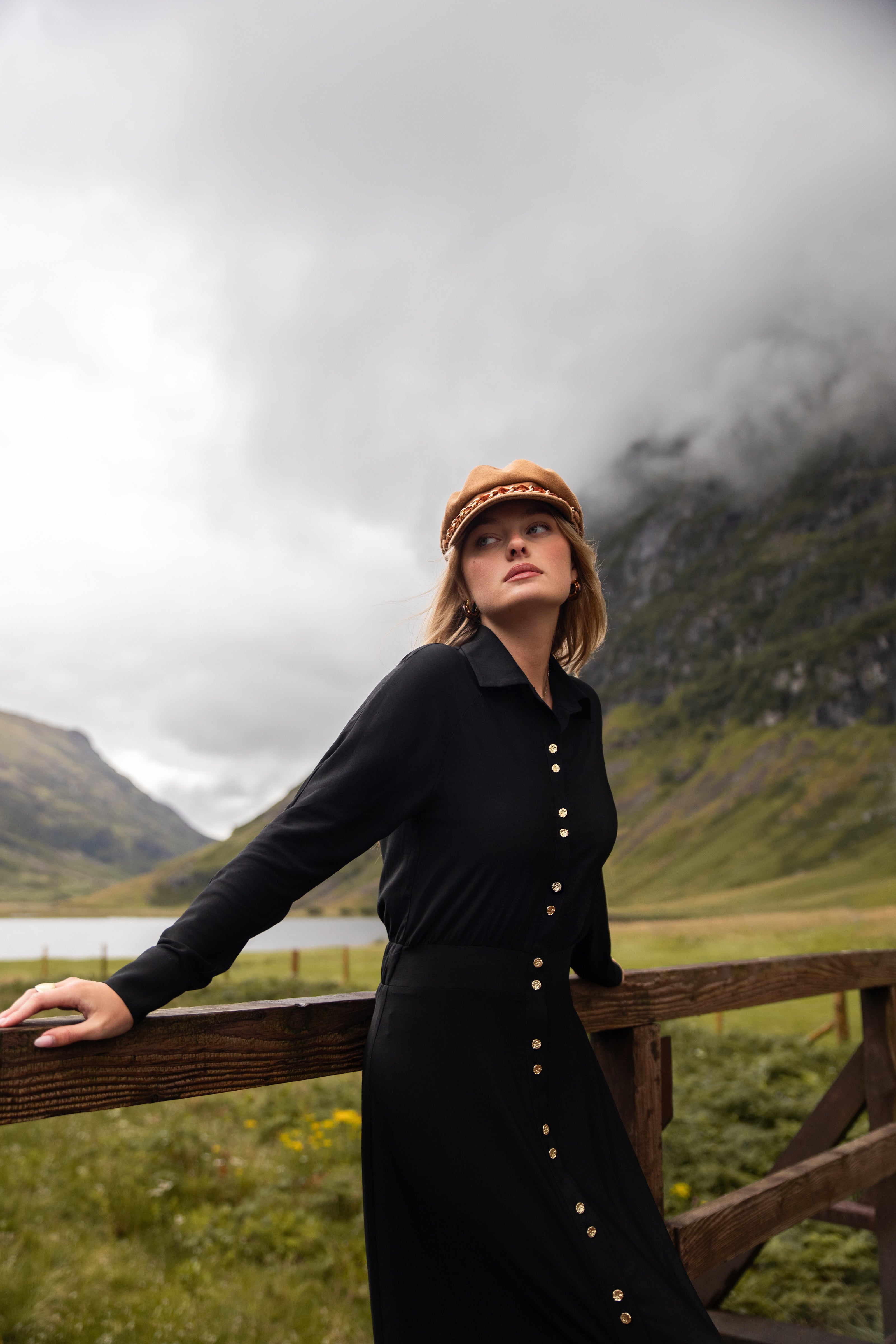 A showstopping woven maxi dress gives a serious upgrade to the classic shirtdress. Magnificent hammered gold buttons are the main feature of this beautiful, waisted dress. We added a couple of discreet hook and eyes to the waist to keep the appearance flat and tapered, and elasticated the back of the waist for ease and comfort. Cuffed sleeves and preppy collar are the finishing touches to this masterpiece of a dress!