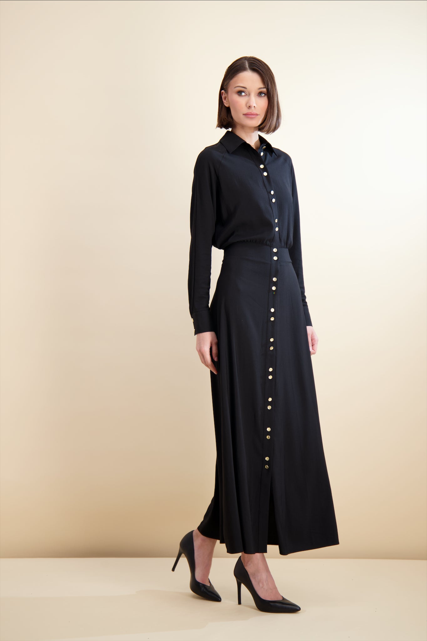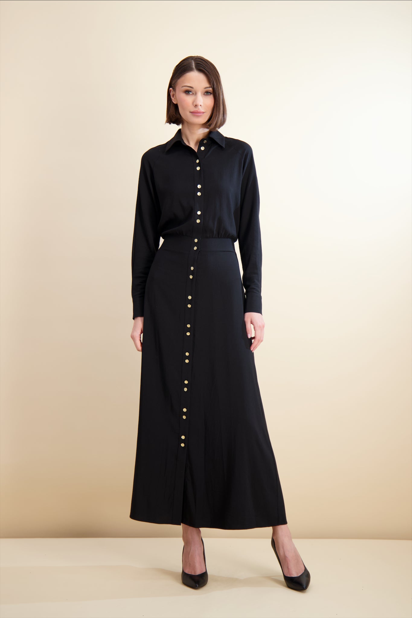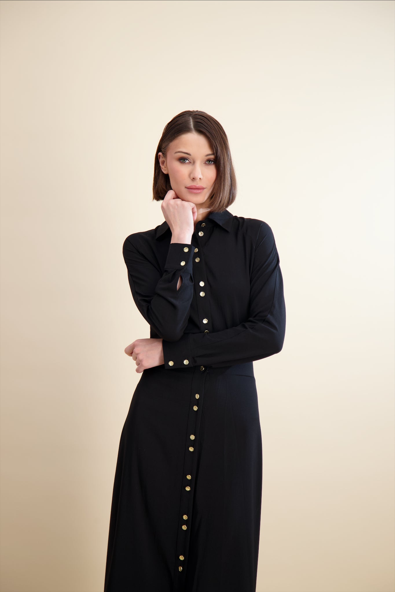 A showstopping woven maxi dress gives a serious upgrade to the classic shirtdress. Magnificent hammered gold buttons are the main feature of this beautiful, waisted dress. We added a couple of discreet hook and eyes to the waist to keep the appearance flat and tapered, and elasticated the back of the waist for ease and comfort. Cuffed sleeves and preppy collar are the finishing touches to this masterpiece of a dress!