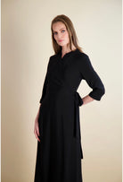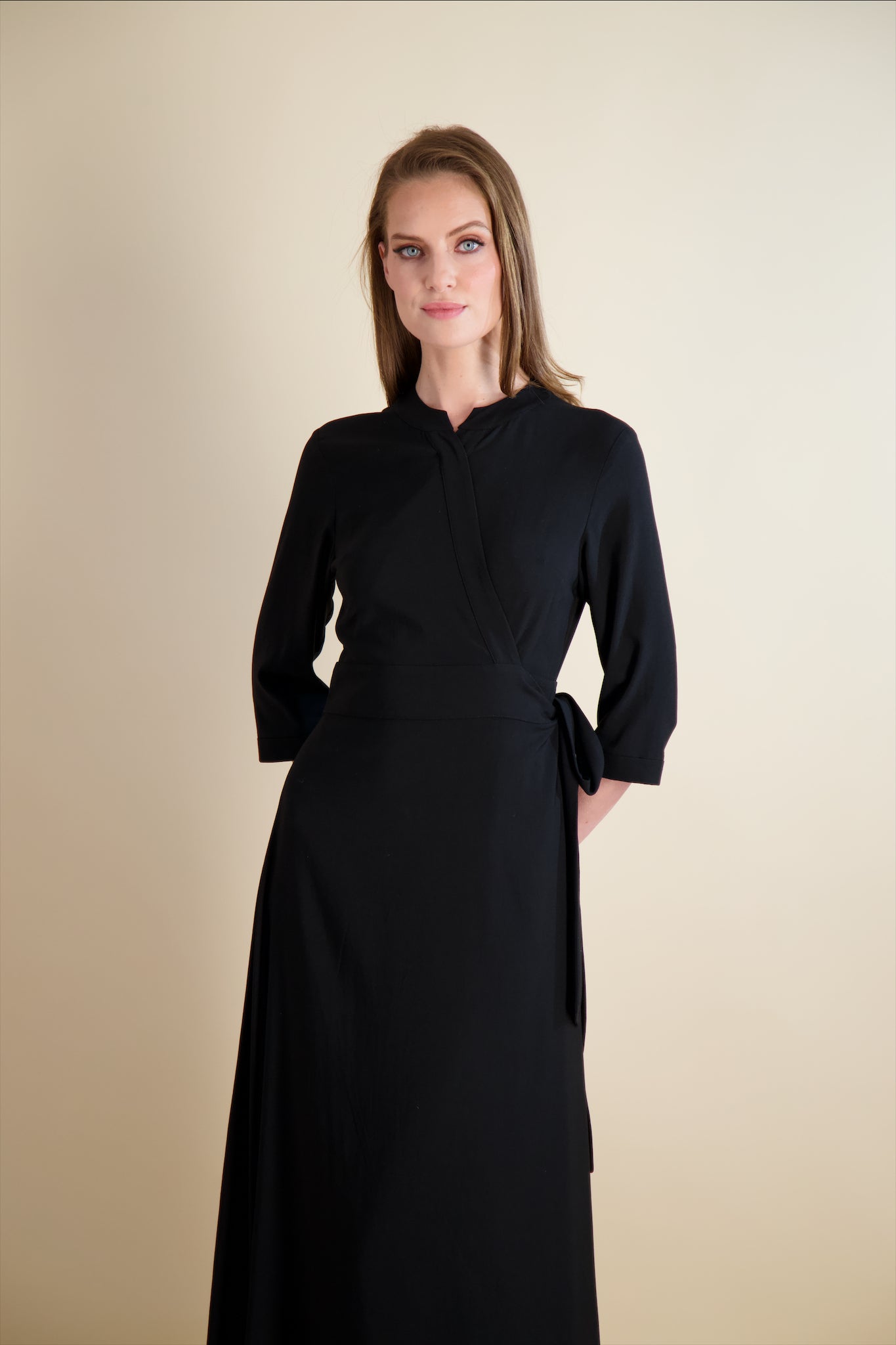 The deep wrap silhouette creates a beautifully flattering shape that hugs in all the right places while elongating the body. For added comfort and confidence, we included an optional snap to keep the wrap secure — a small detail that makes a big difference. The loose, cuffed 3/4 sleeves add softness and balance, giving the dress an elegant, unfussy feel.