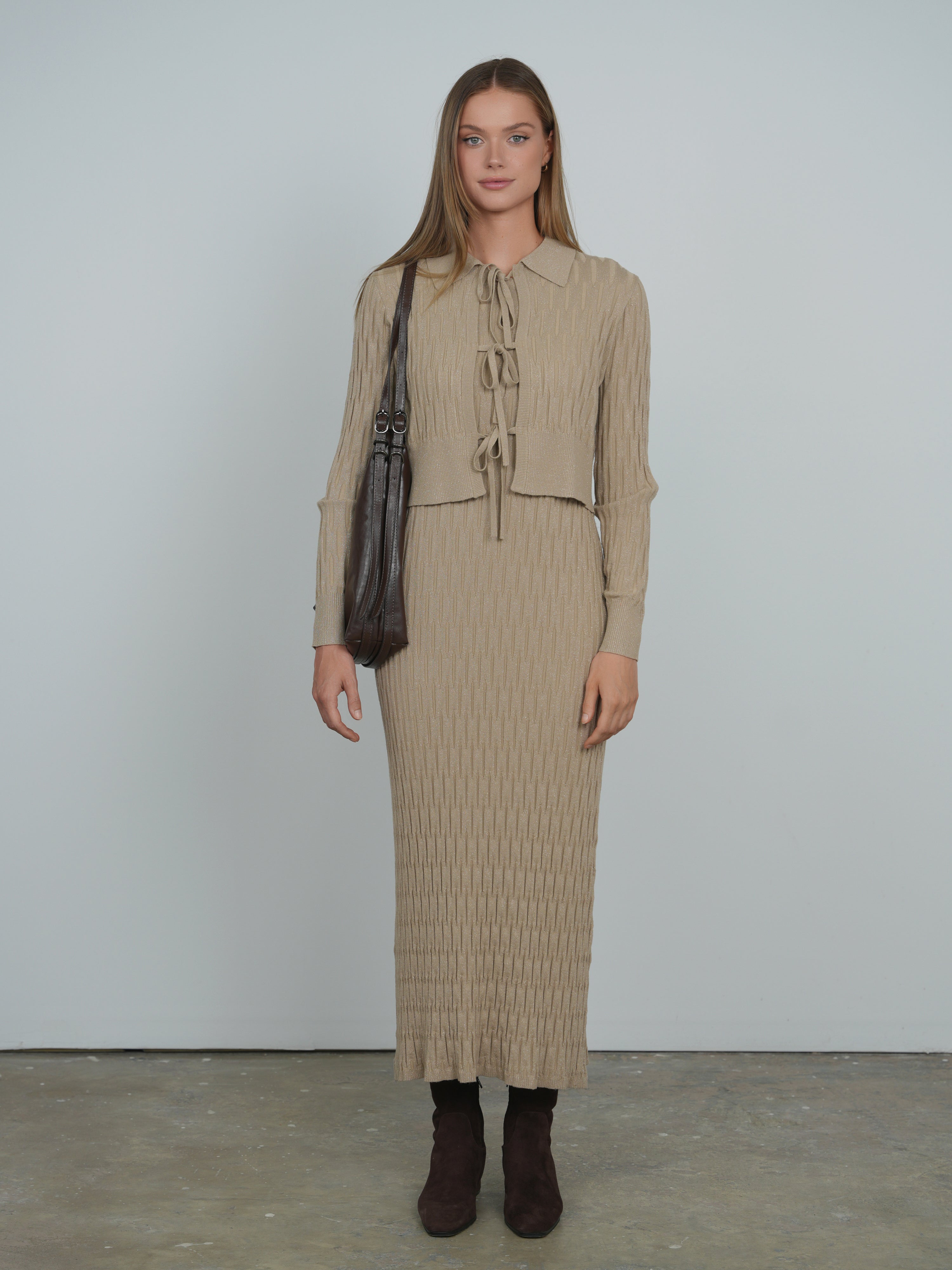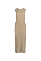 The Point Metallic Knit Dress exudes modern elegance with its sleek silhouette and shimmering metallic knit fabric. Designed for a flattering fit, this dress combines subtle sparkle with comfortable stretch, making it perfect for day-to-night transitions. Its refined texture and minimalist design allow for versatile styling, whether layered with accessories or worn alone to make a sophisticated statement. A chic addition to any contemporary wardrobe.