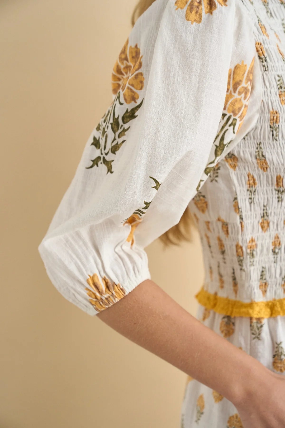 It features round neck and so many feminine details. Its stretchy smocked bodice finishes with a delicate crochet trimming, and gives way to a full-lenght skirt with in a big ruffle at the bottom.