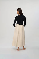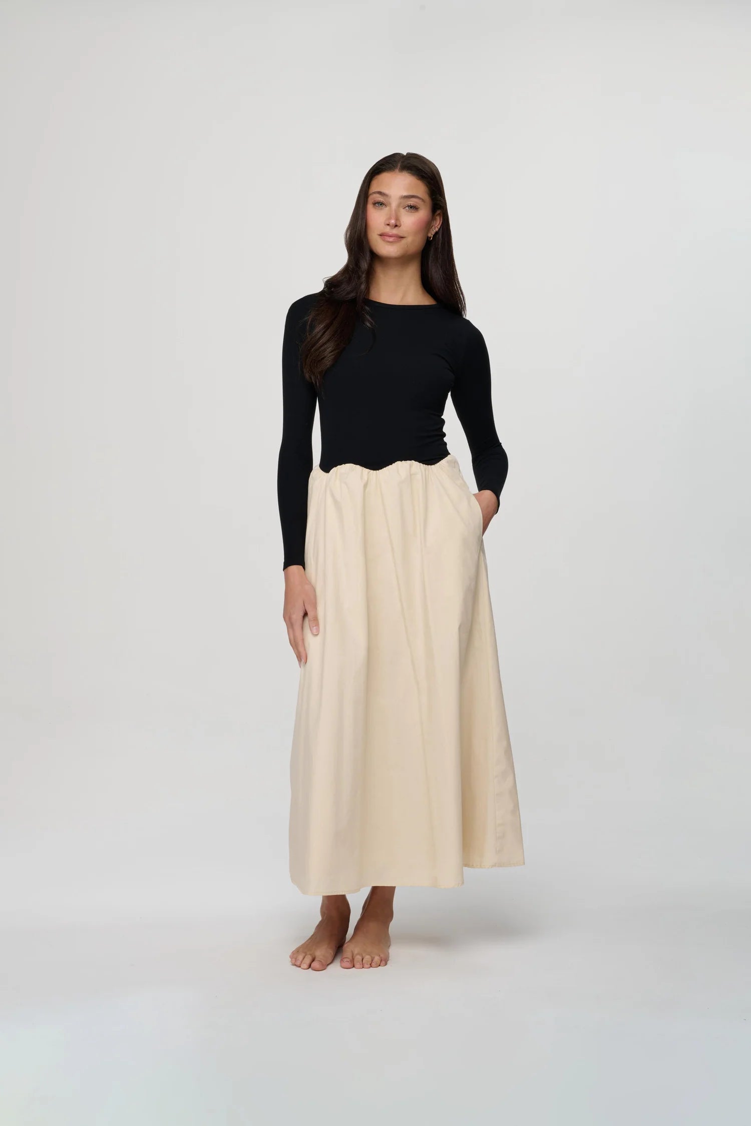 The Brynn Dress features a flattering silhouette with a stretchy fitted top and a scalloped waistline that flows into a full skirt. It includes side pockets for added practicality. This standout shape has become a customer favorite for its comfortable fit and polished look.