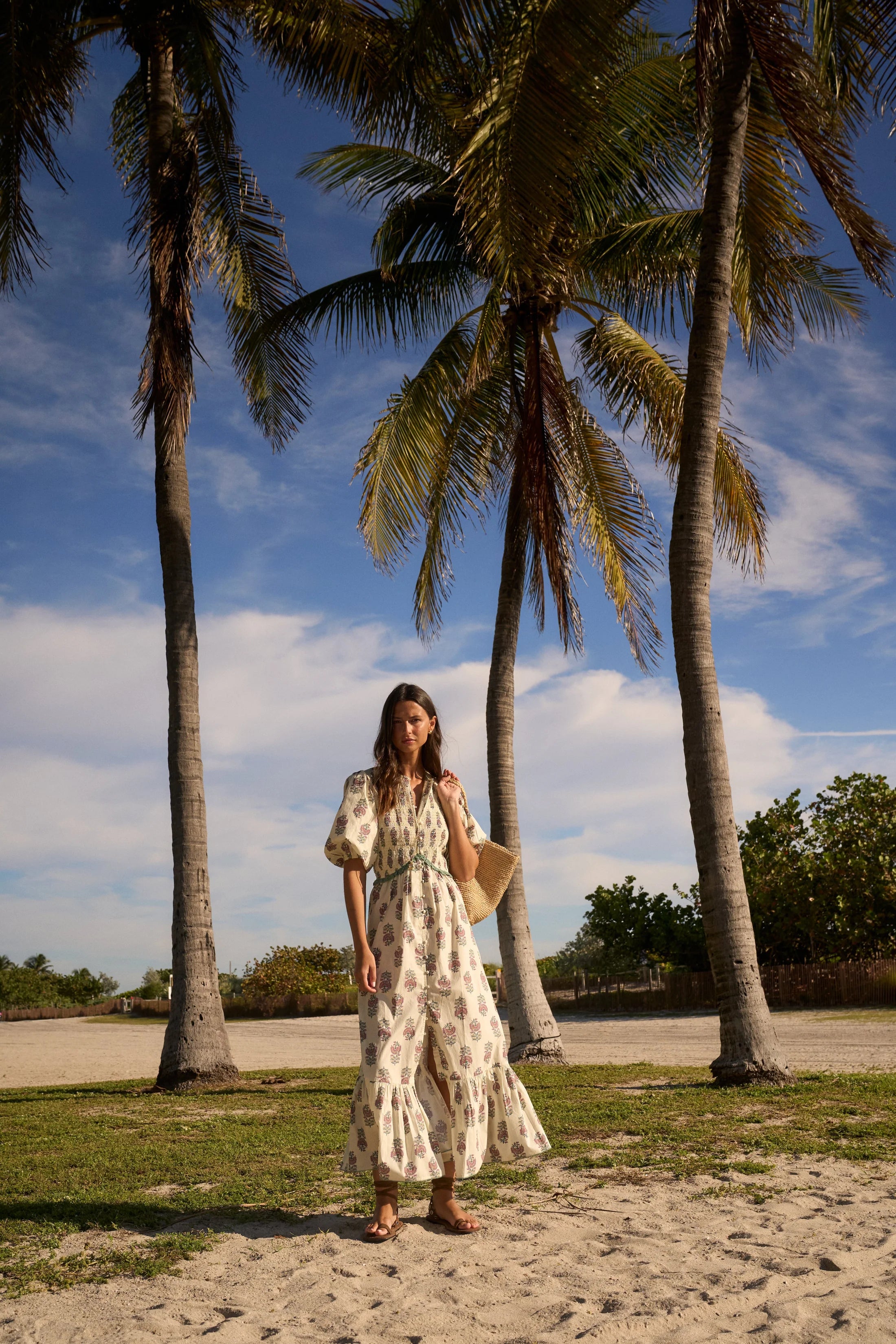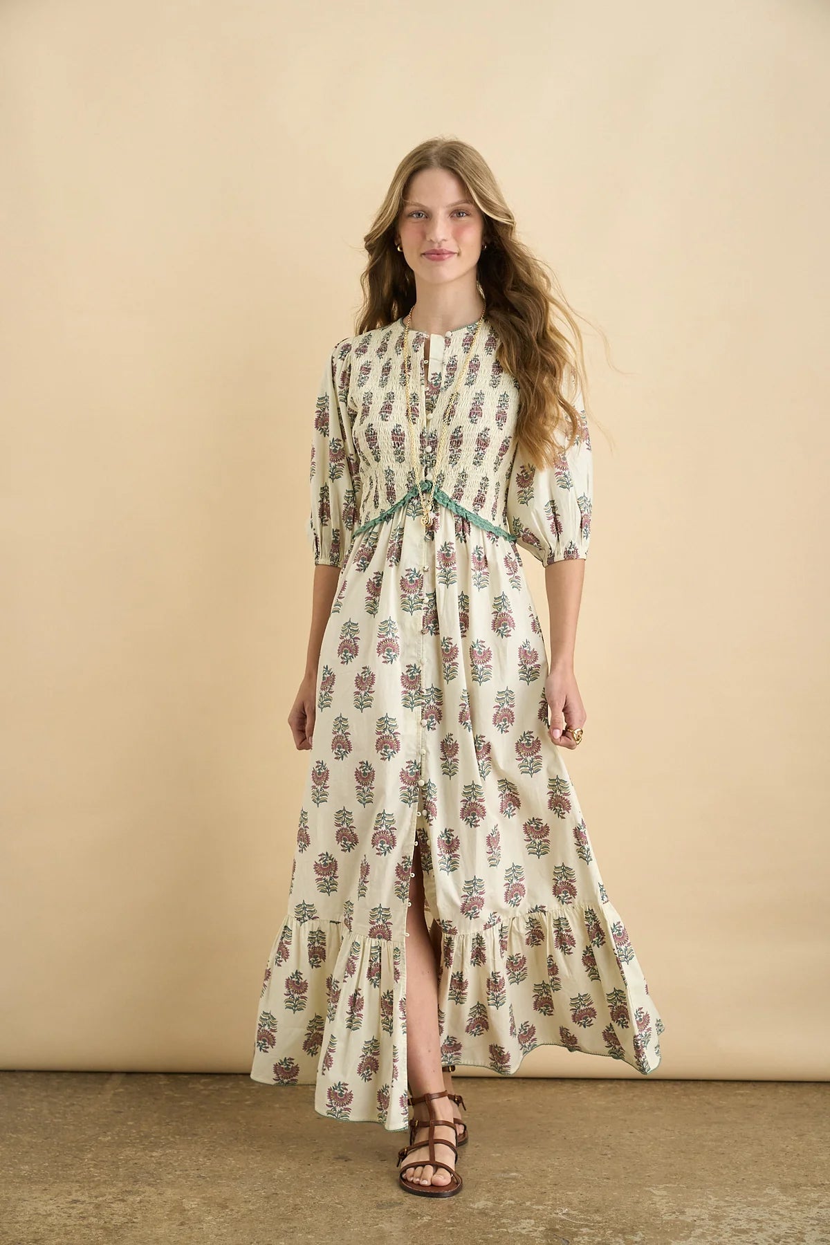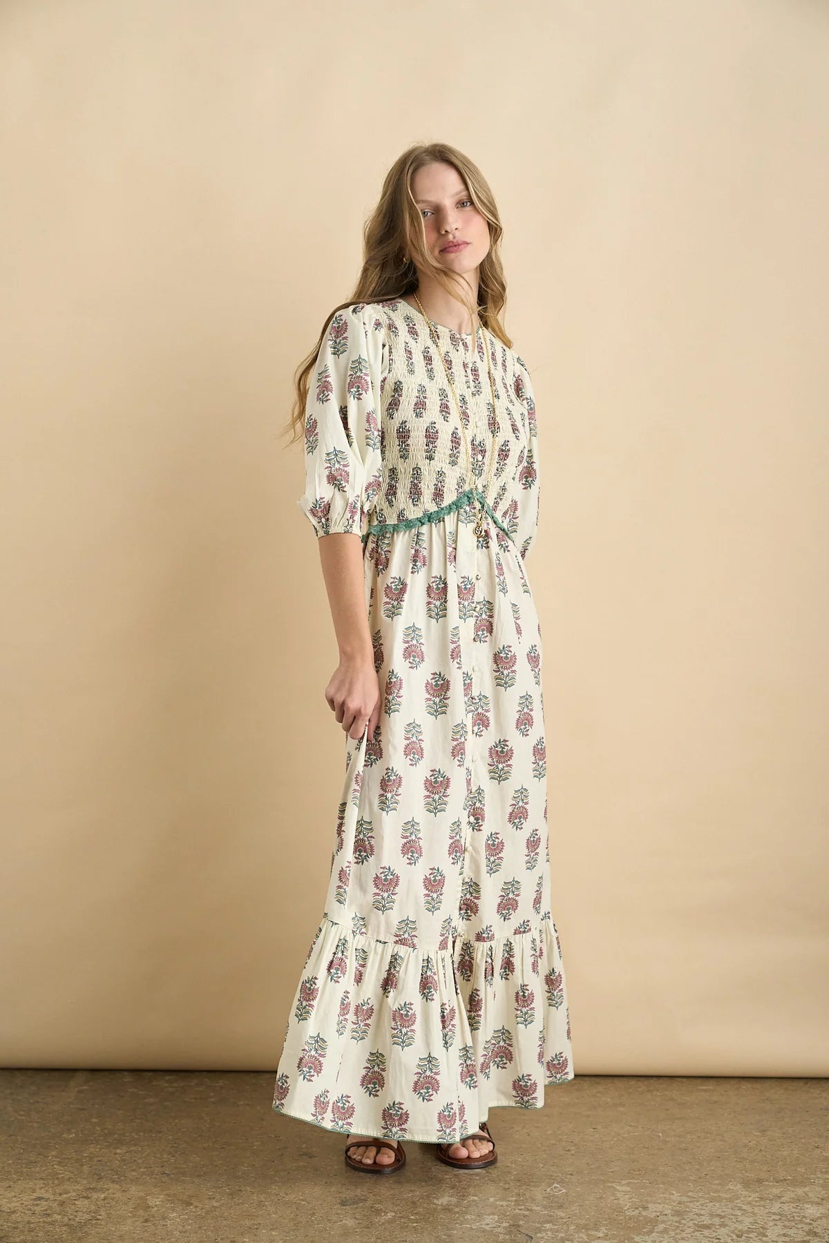 Long print dress inspired by the Edwardian era, made in delicate organic cotton printed with Sonmers traditional Indian flower motif in beautiful colors.
