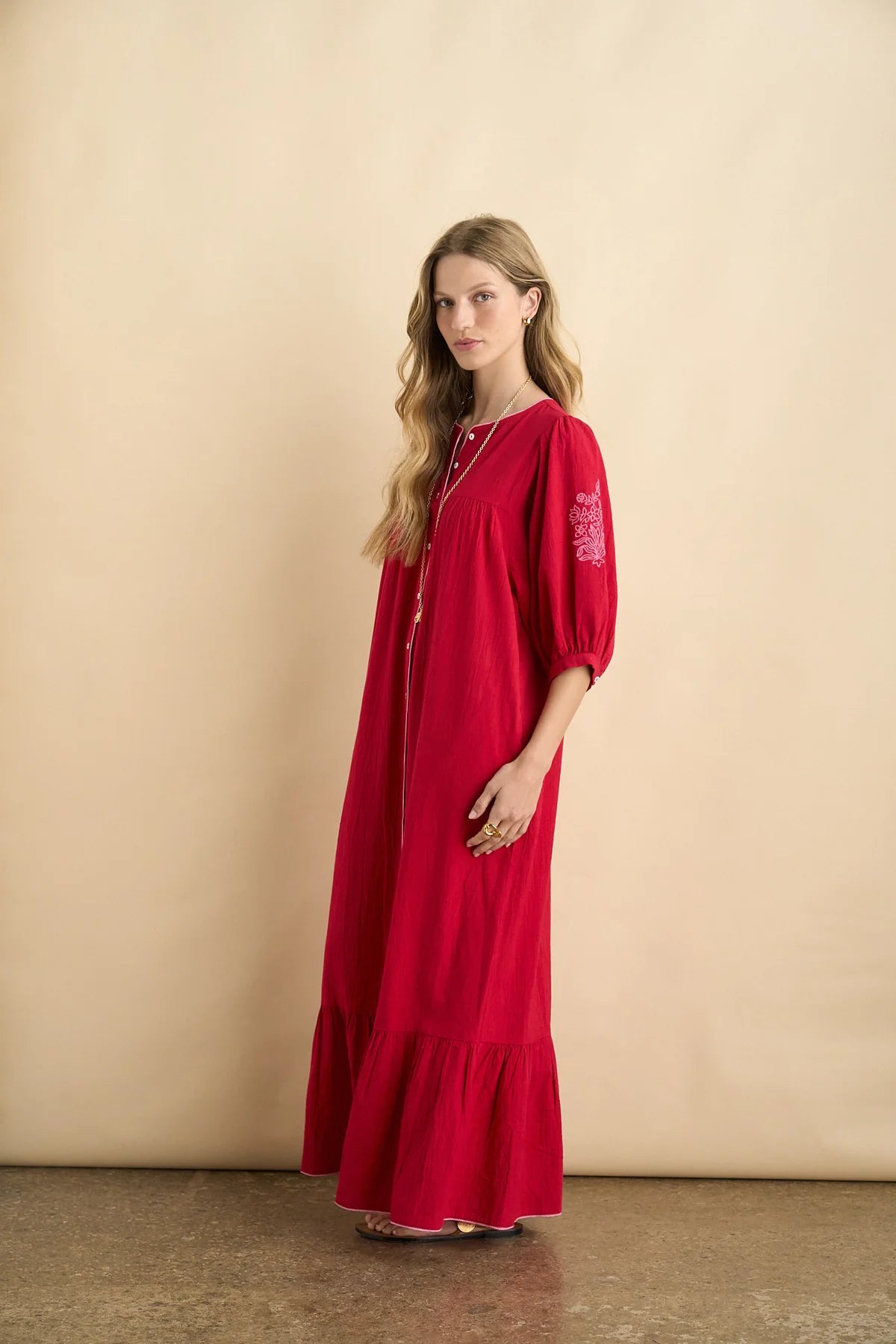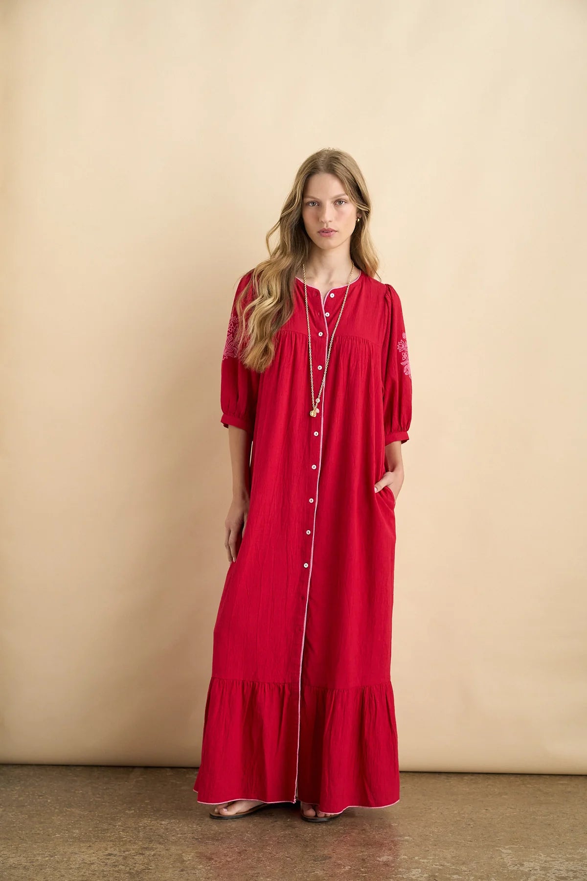 Dinners loved maxi dress Sofia features short sleeves covering elbow and front button closure