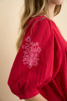 This piece is made in cotton with a rustic texture and features delicate embroidery on the sleeves.
