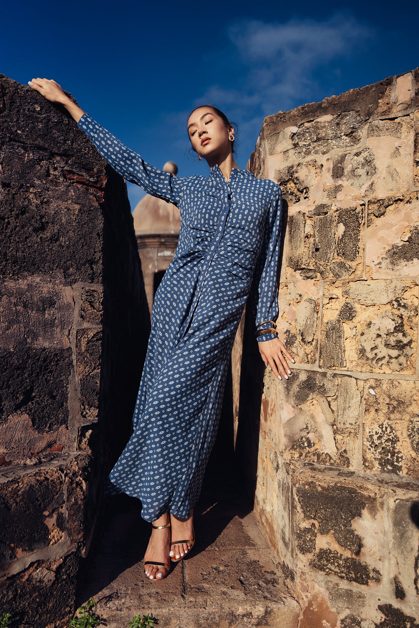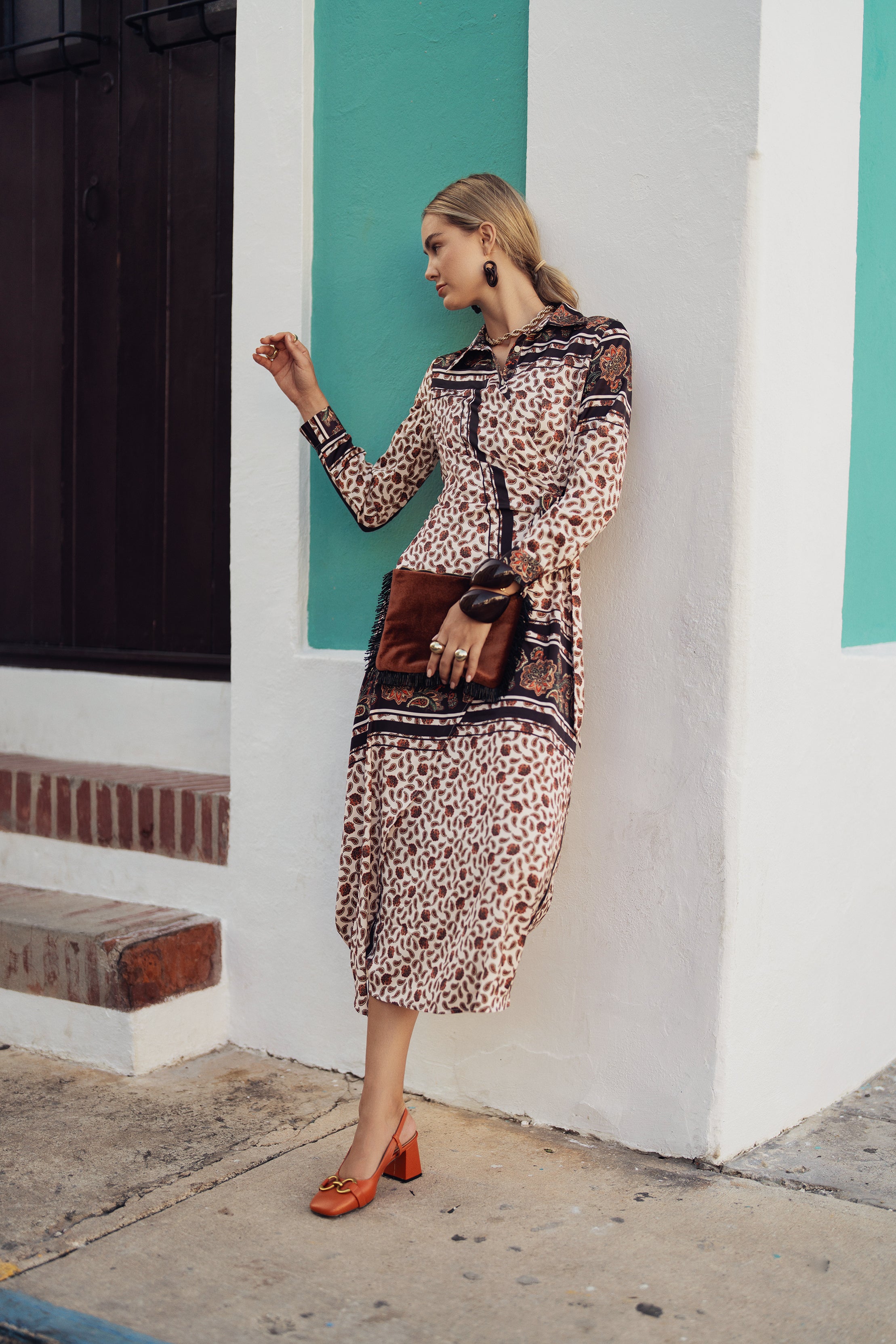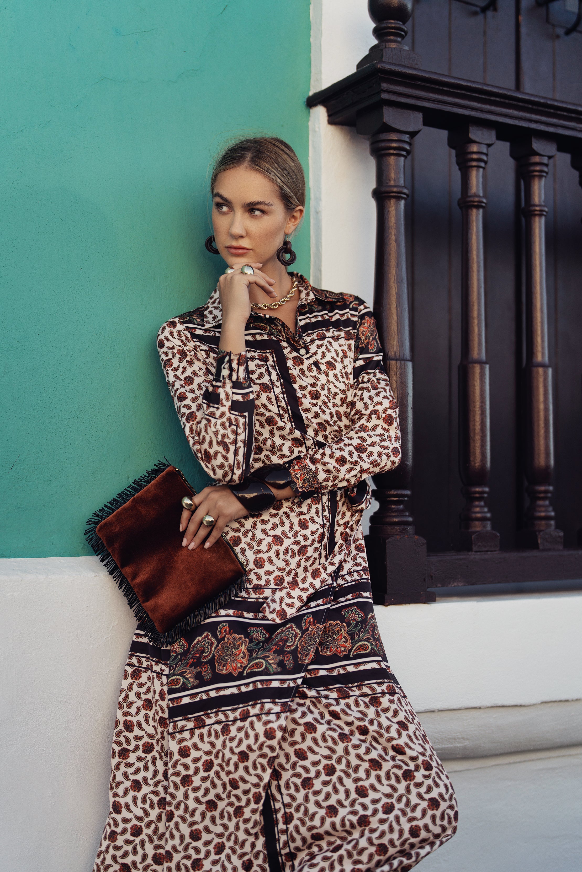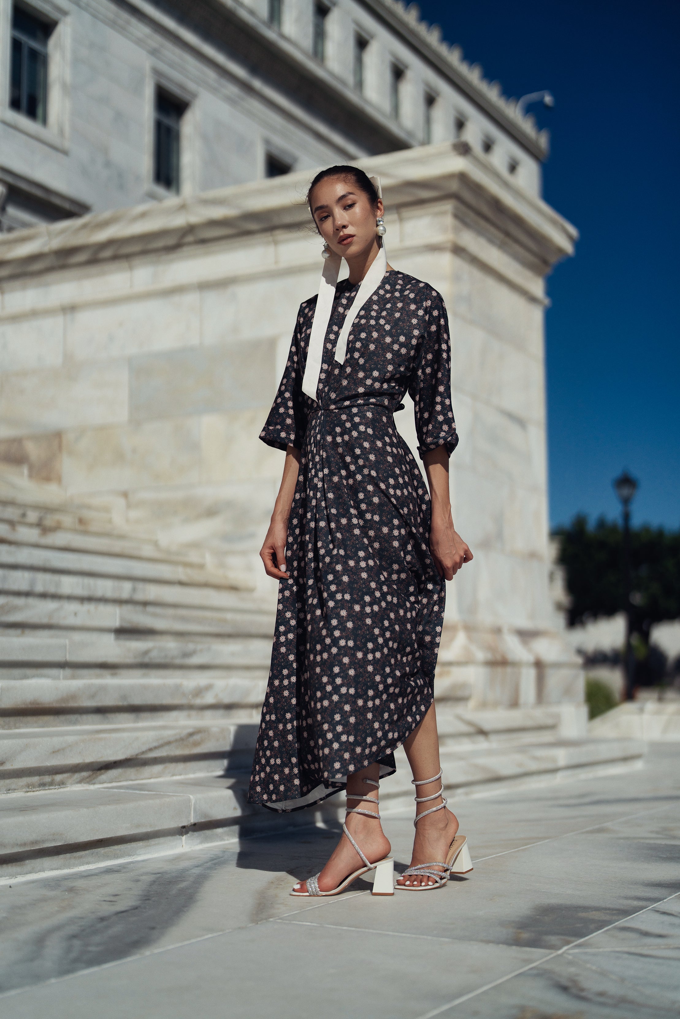 Bliss Satin Front Pleat Dress Green/Tan Floral