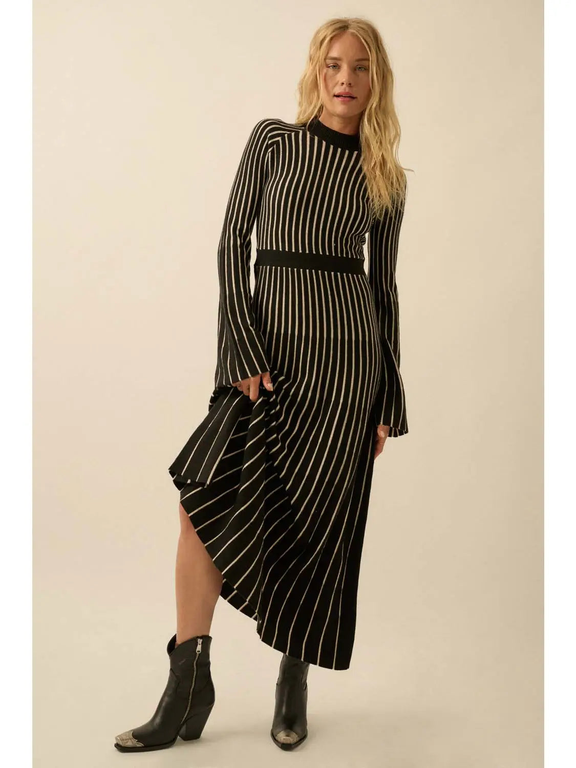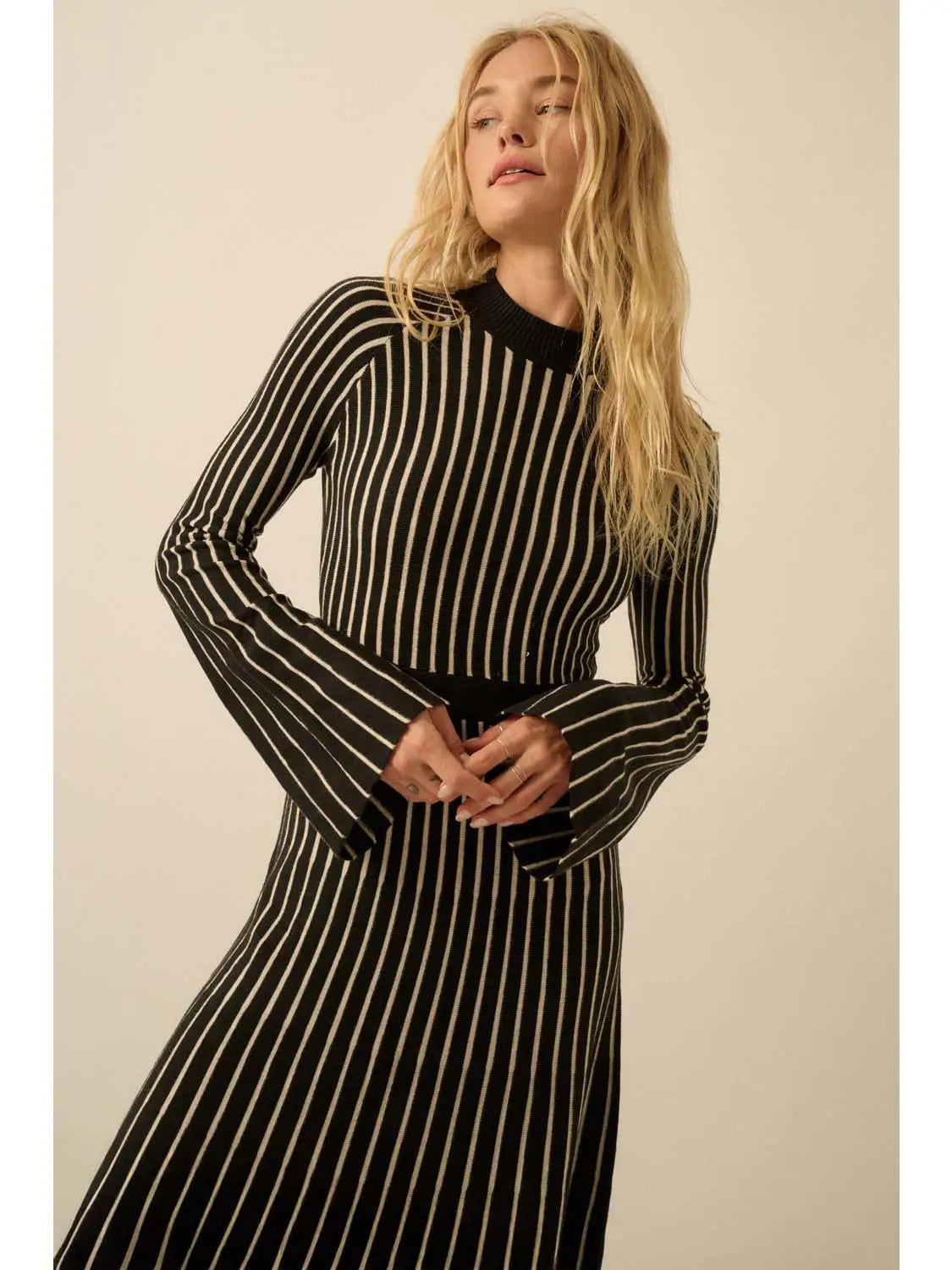 Striped Rib Knit Bell Sleeve Sweater Dress - Black