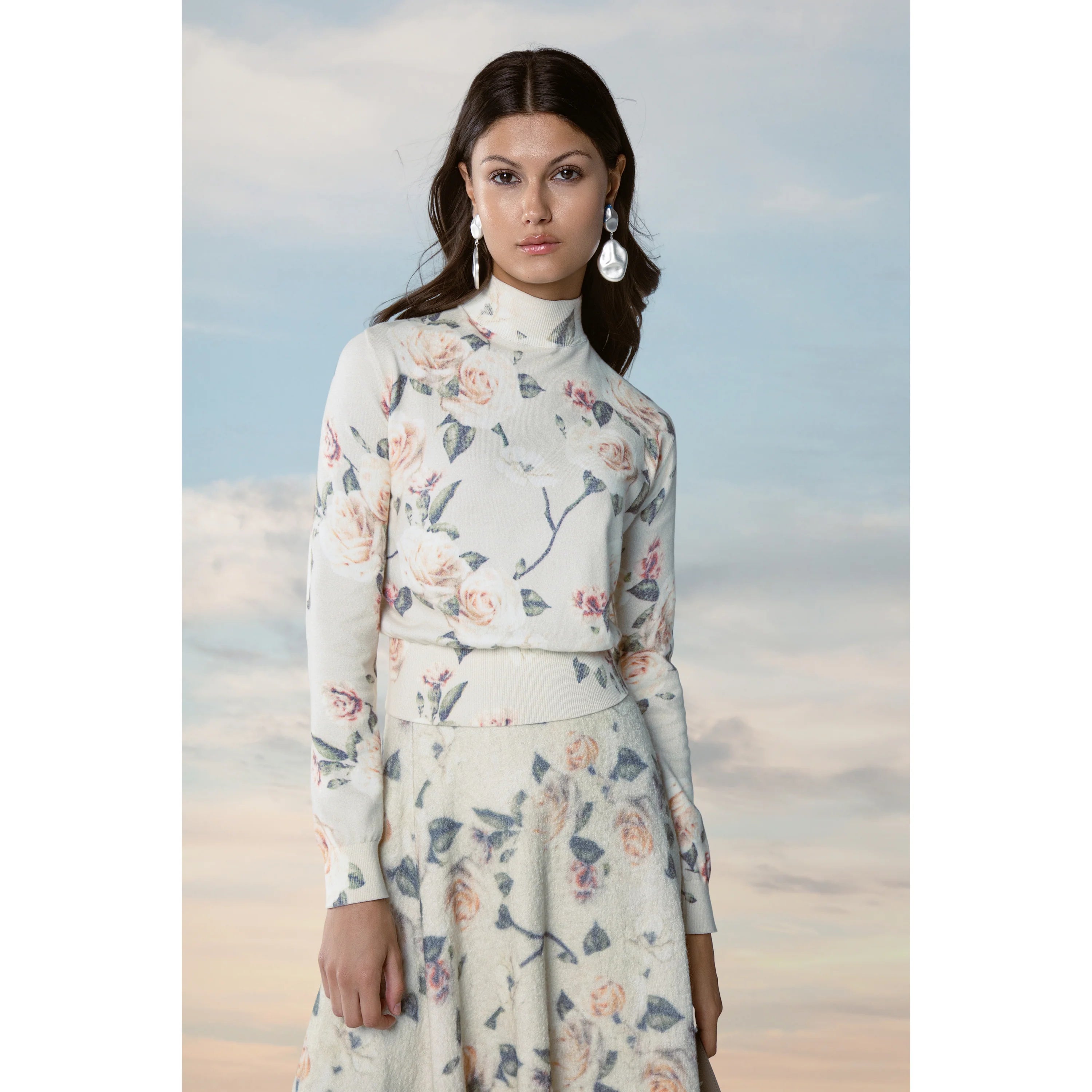 Point Printed Mock Neck Top - White Roses
