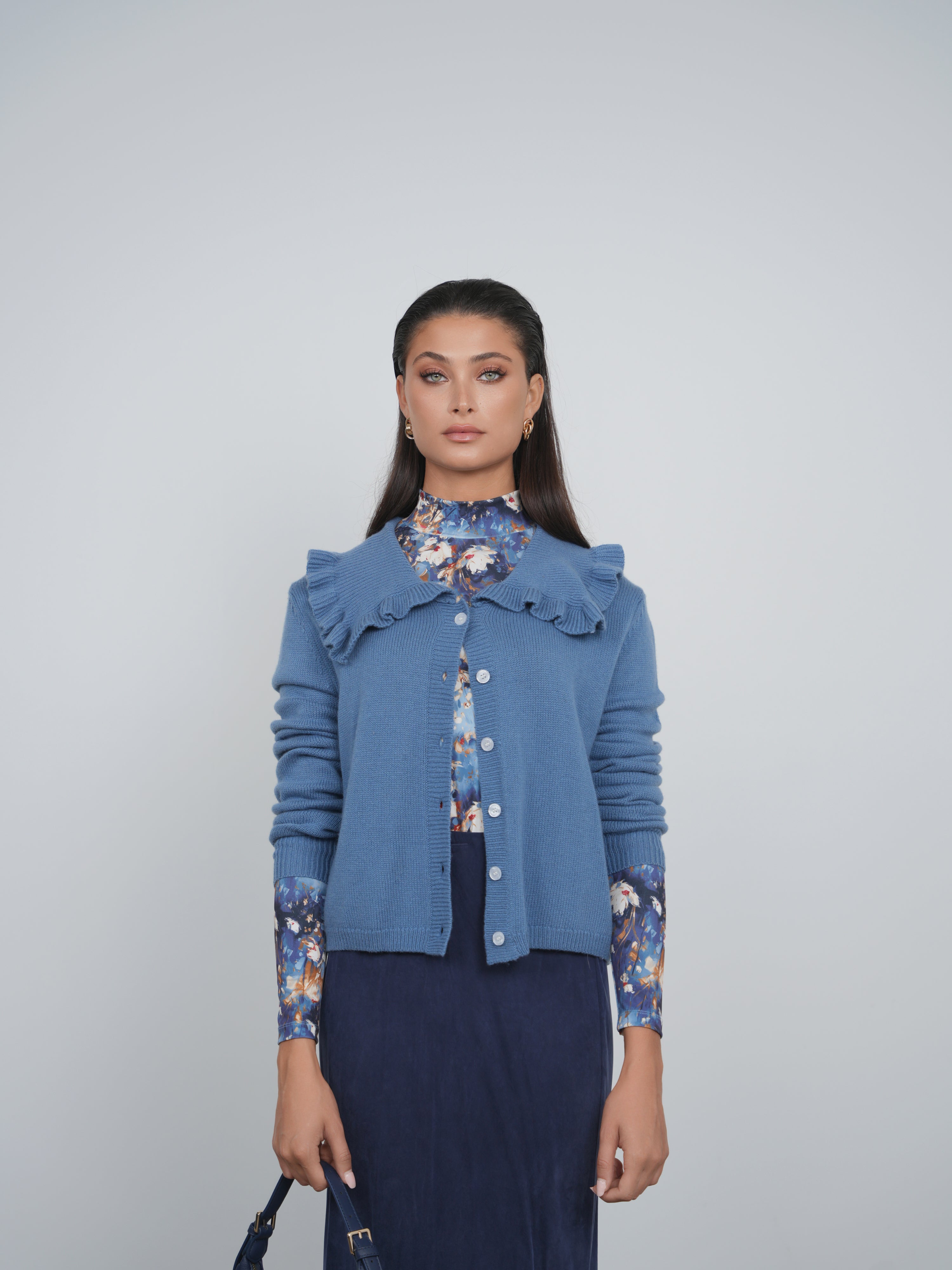 Point Fine Knit Ruffle Cardi - Retro Blue