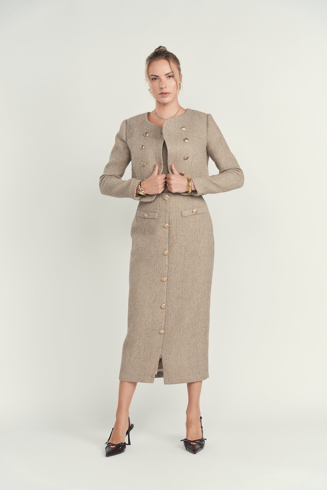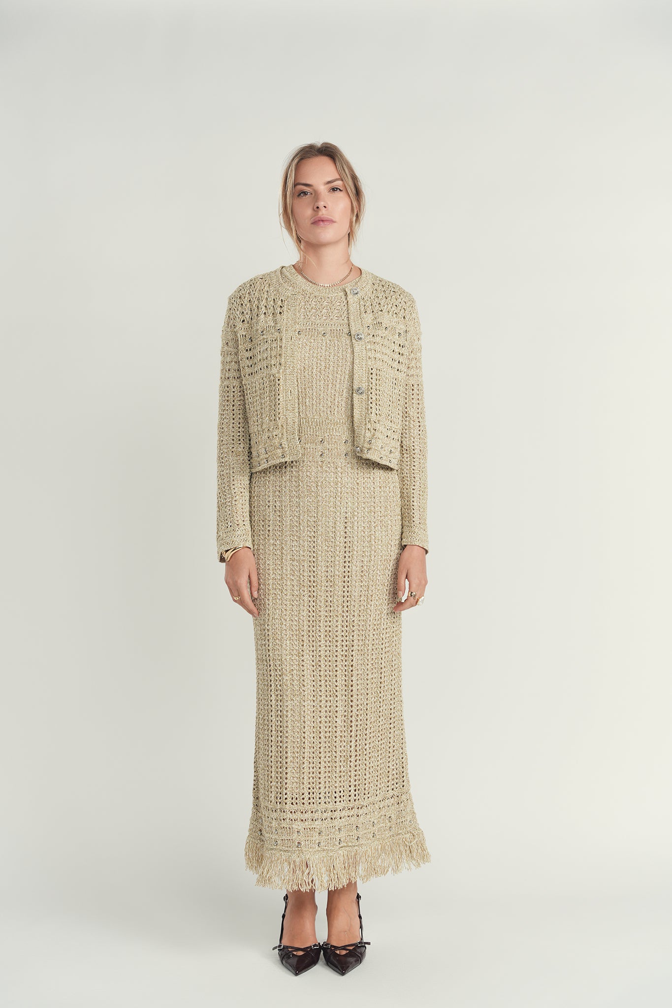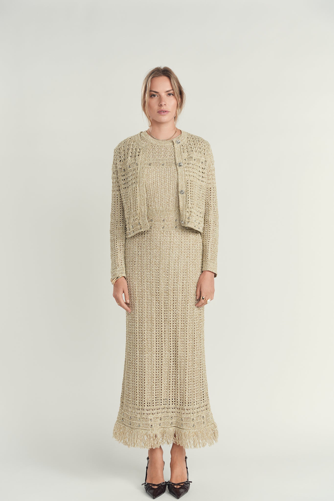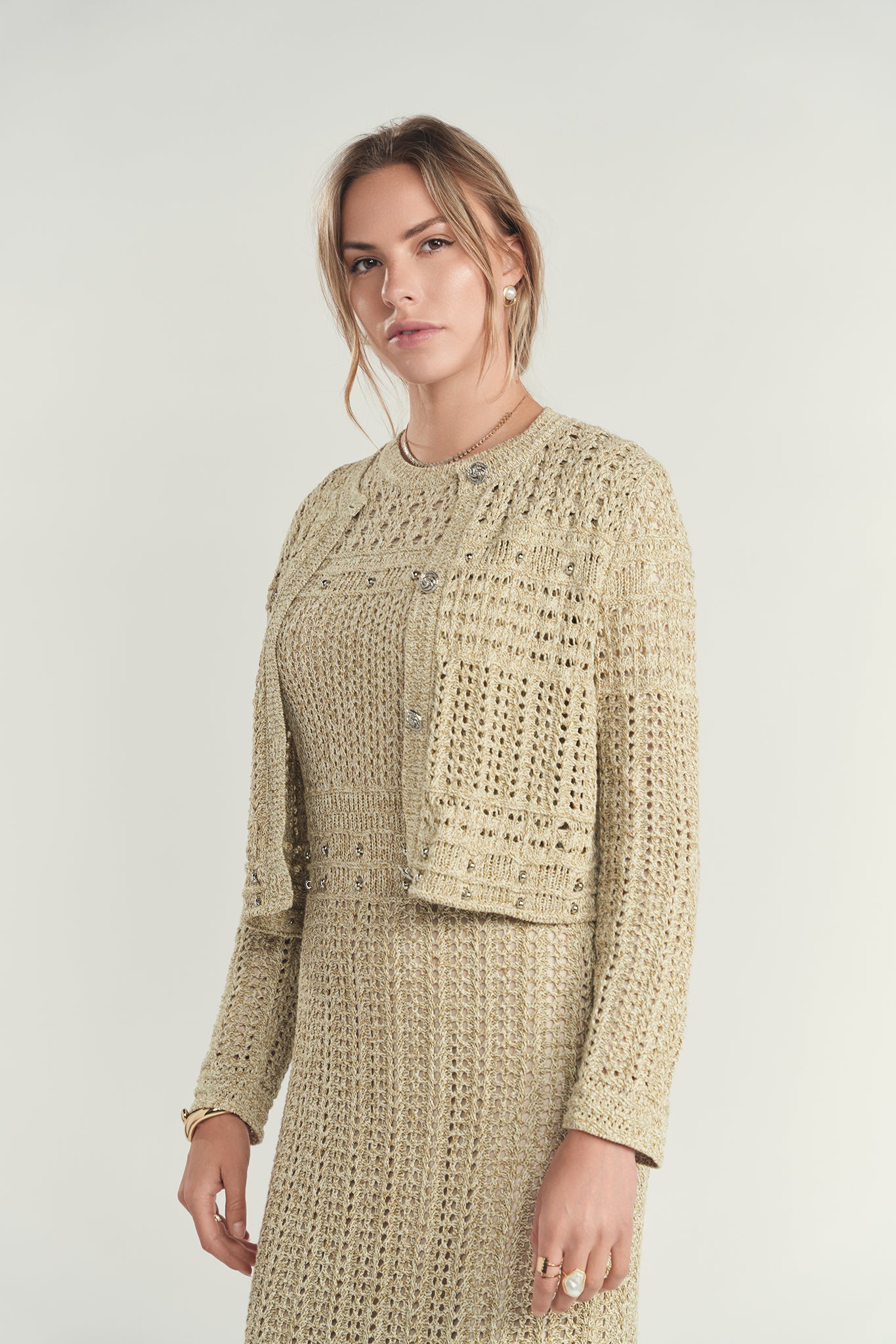Ellie Makir Shimmer Knit Dress & Cardigan Gold Hue
