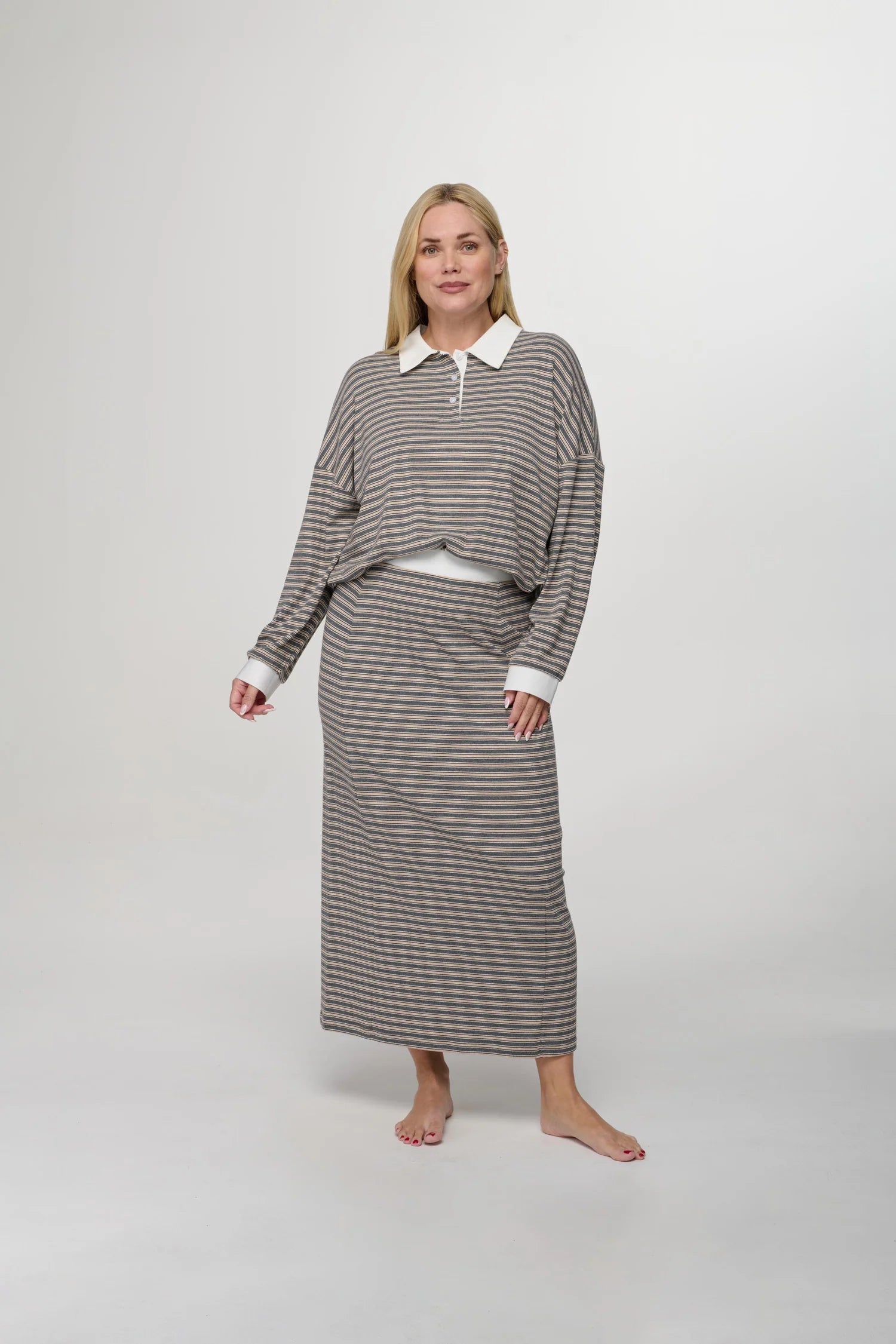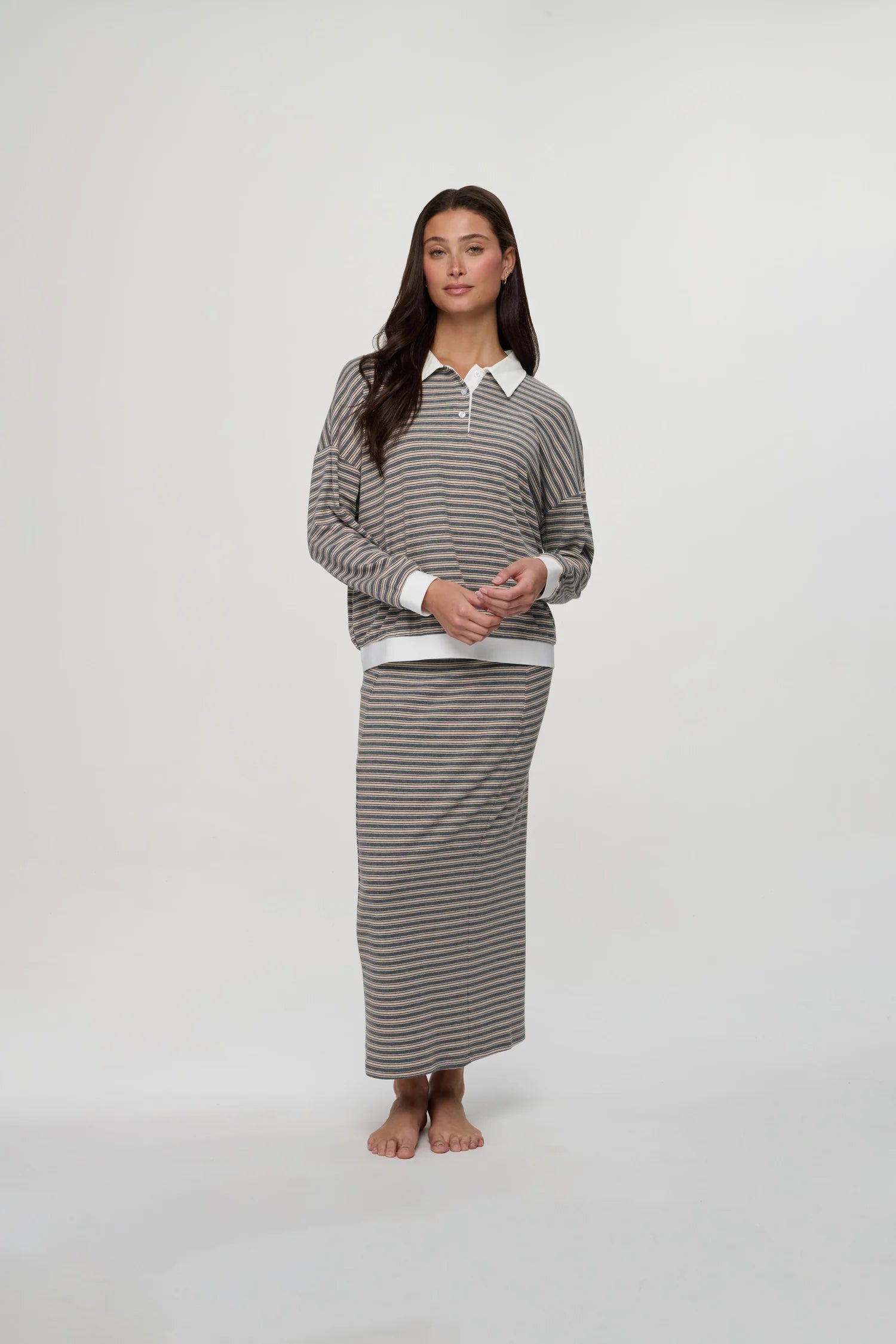 The Kyra Polo is a loose-fitting polo designed for an easy, comfortable feel. It’s the perfect set piece for when you want to look put together while staying relaxed, and works well for transition seasons. Pairs well with the Kyra Skirt for a coordinated set.