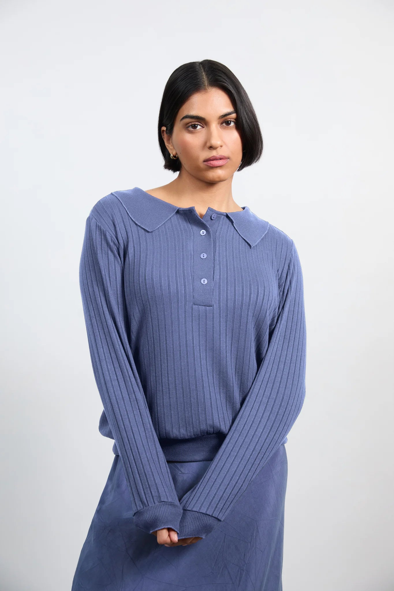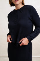 Inspired by Solikas favorite Alaia midi, now reimagined as a top for those who love a matching set :) Introducing Ora — Solikas signature rib-knit polo, crafted from luxe, soft fabric for all-day comfort and easygoing style. With its long sleeves and easy silhouette, Ora adds a polished, laid-back edge to any look—day or night.