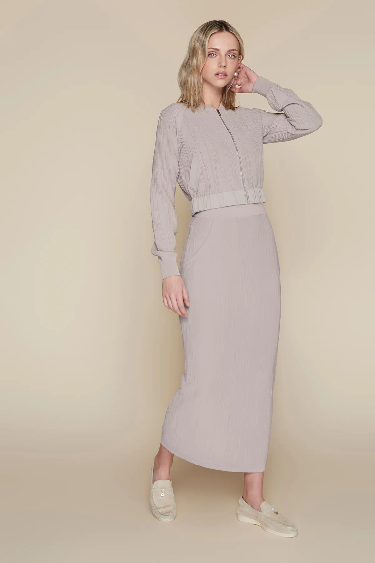 Effortless elegance meets everyday comfort in the Maxi Cannes Skirt. Crafted from a lightweight breathable knit gauze, it features a straight silhouette that drapes beautifully, a stretchy waistband for all-day ease, and functional pockets. Pair it with the Cannes top for a polished look or layer it under the Cannes bomber for added dimension. Perfect for warm weather styling.
