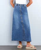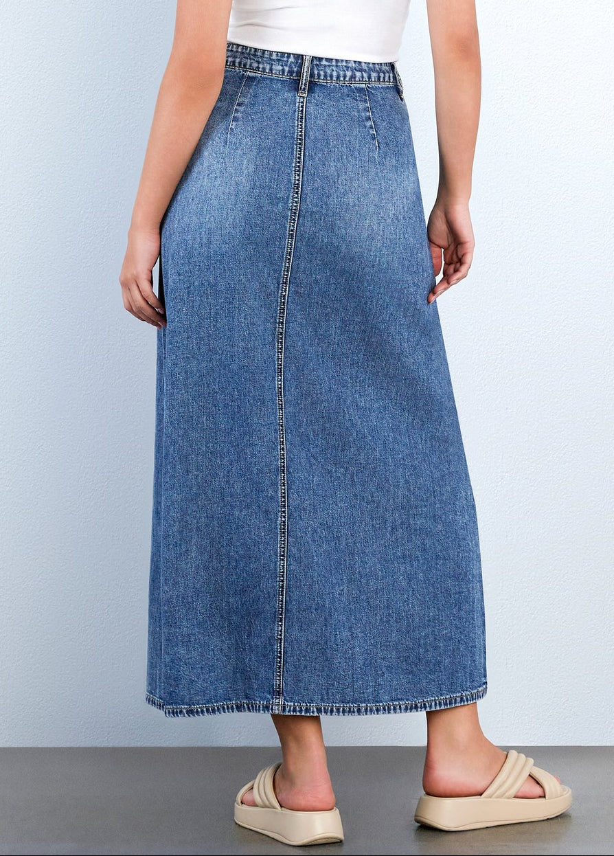 This denim maxi skirt showcases a refined button-front closure that combines functionality with understated style. Constructed from soft, breathable denim, it drapes elegantly to the ankle while maintaining structure through wear. The streamlined silhouette works seamlessly with both casual basics and polished pieces, making it an essential foundation for a versatile wardrobe. Quality stitching and premium fabric weight guarantee enduring durability.